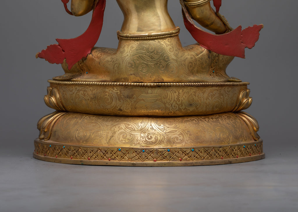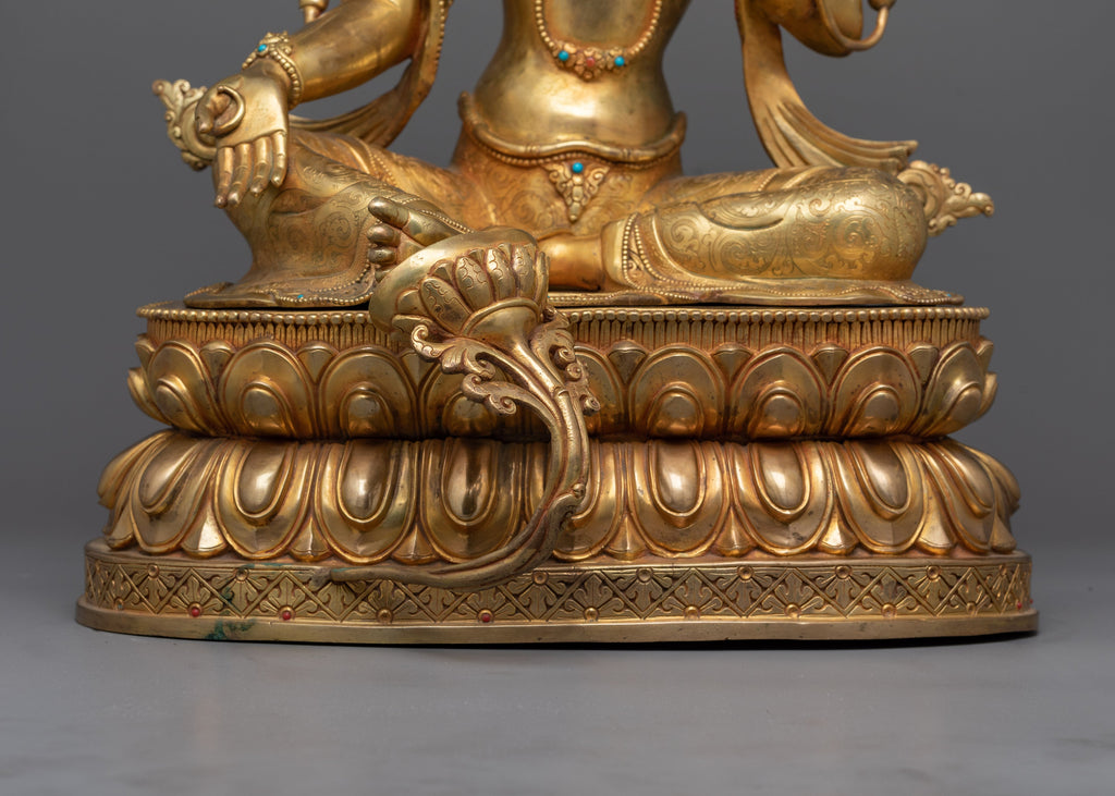The Graceful Tara Gold Gilded Statue, standing gently at 21.5 inches, radiates a tranquil aura of compassion and beauty. This beautiful statue is carefully handcrafted of copper, brilliantly gilded in 24K gold, and complemented with finely detailed paintwork in both gold and acrylic. Tara represents compassion, protection, and wisdom in Tibetan Buddhism, which makes this statue a valuable addition to any hallowed area.