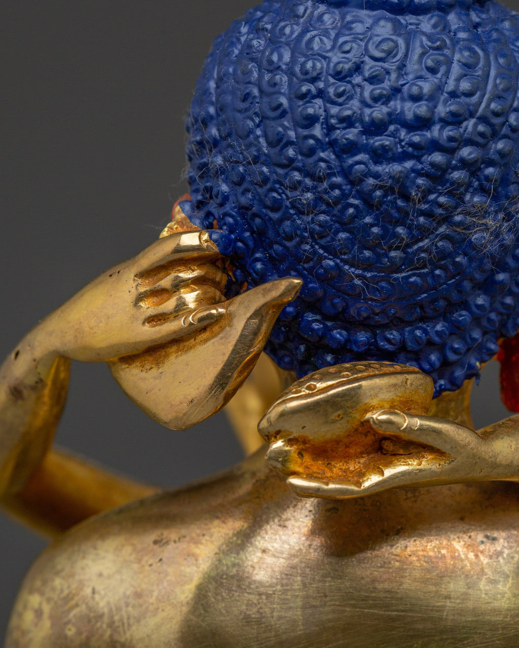 In his iconography, Samantabhadra is depicted with a uṣṇīṣa, symbolizing his enlightened wisdom and spiritual attainment. He sits gracefully in vajrāsana (diamond posture) on a lotus base, holding his consort in his arms while his hands rest in the dhyāna mudrā, the gesture of deep meditation. His consort holds two ritual items: a kapāla (skull cup), symbolizing transformation, and a kartikā (ritual flaying knife), representing the cutting through of ignorance and obstacles. This imagery emphasizes their union of wisdom and compassion in enlightened activity.