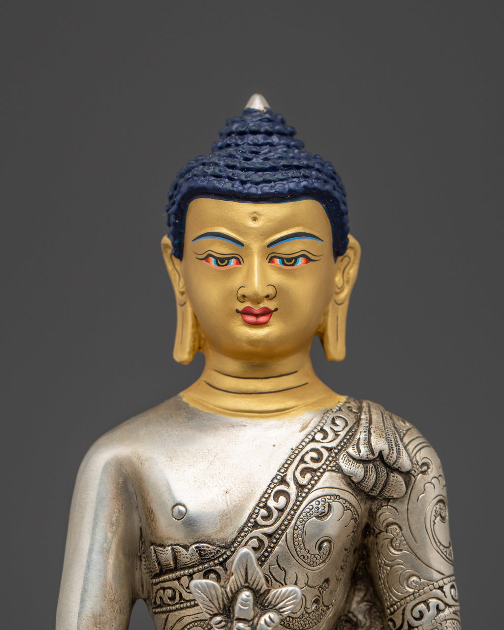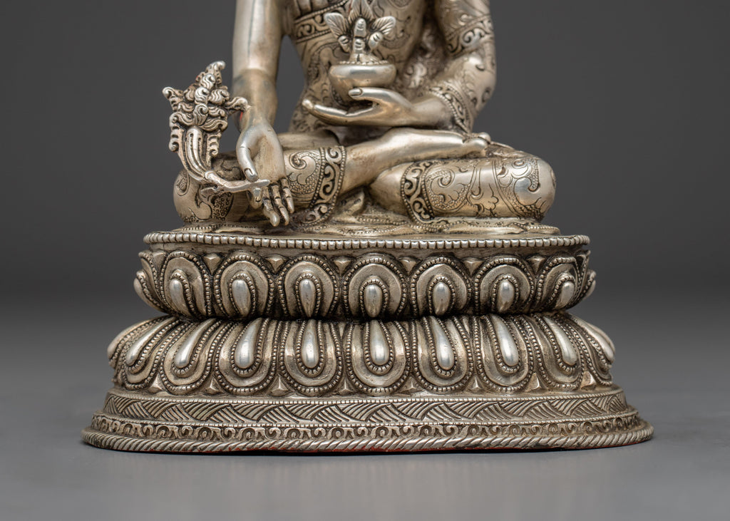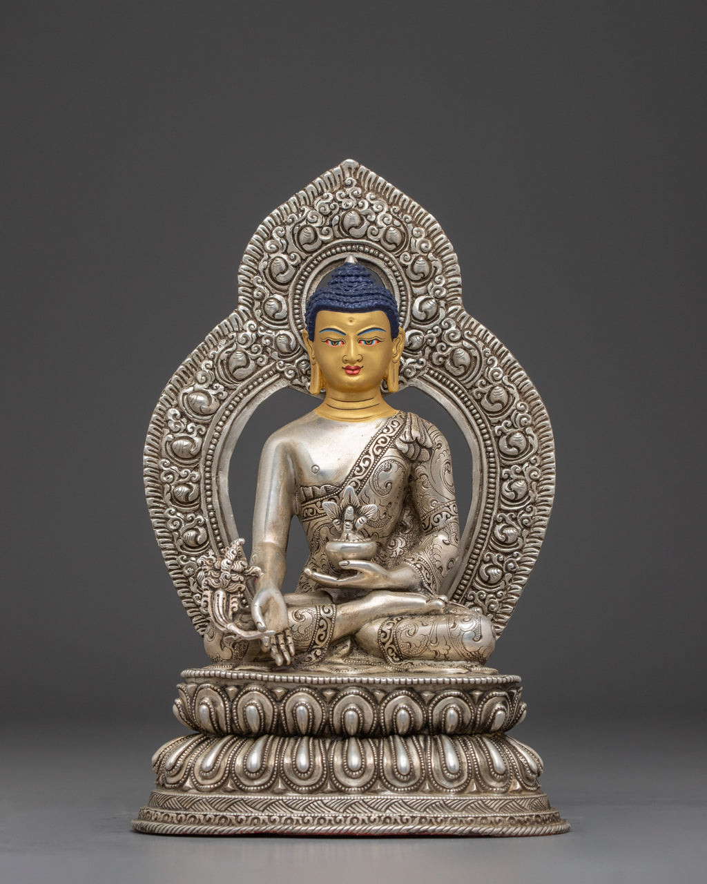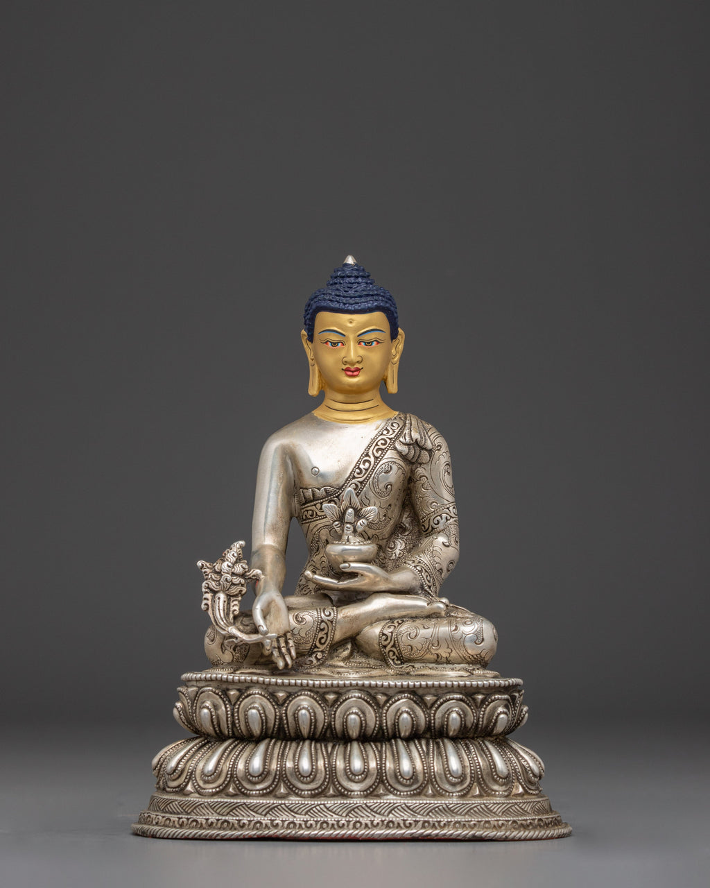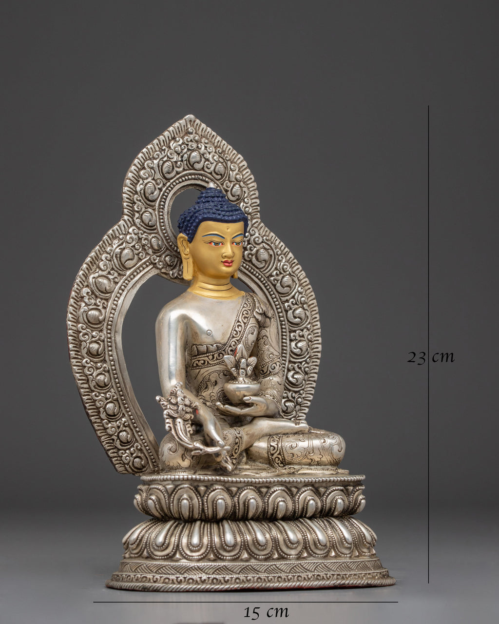 The Great Healer Medicine Buddha Art stands 9 inches (23cm) in height with a base width of 5.9 inches (15cm), making it a graceful piece for any space. Crafted from a copper body, the statue is adorned with Silver and intricate gold and acrylic paintings, which highlight its spiritual significance and artistic craftsmanship. Symbolizing healing, compassion, and tranquility, this statue embodies the essence of the Medicine Buddha.