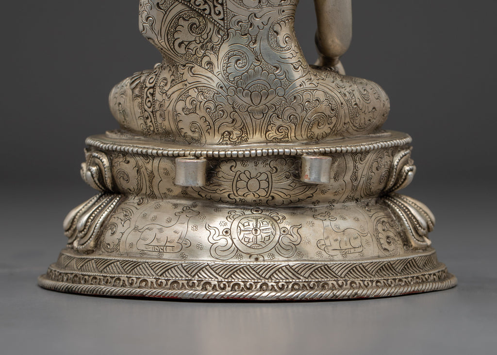 The Medicine Buddha is depicted holding an alms bowl in which a healing portion is believed to be found. In his right hand, he carries a myrobalan plant, a medical herb that represents his capacity to heal physical and spiritual illnesses. His right arm has an exquisite carving of one of 8 auspicious symbols (Endless Knot). This symbolizes Samsara, the endless cycle of suffering within Tibetan Buddhism, which includes the chain of birth, death, and rebirth. His tranquil visage and powerful aura exude a sense of deep compassion and serenity, promising protection and well-being to those who seek his blessing.