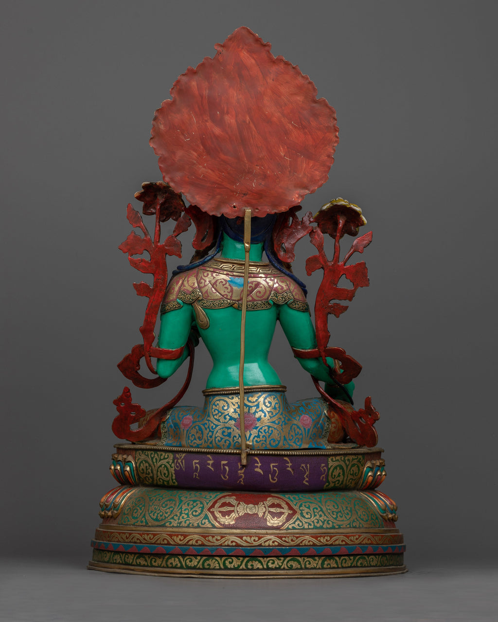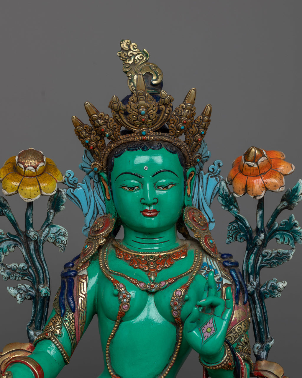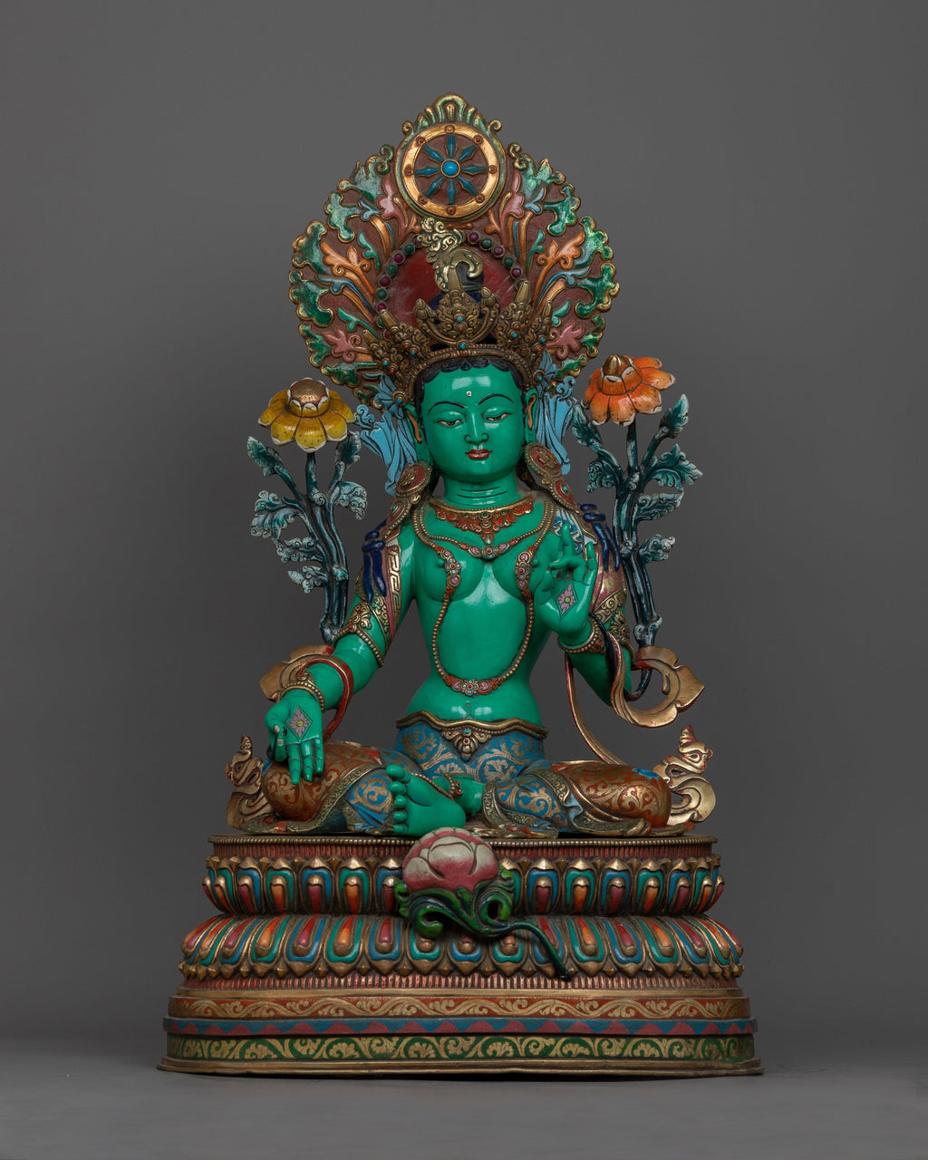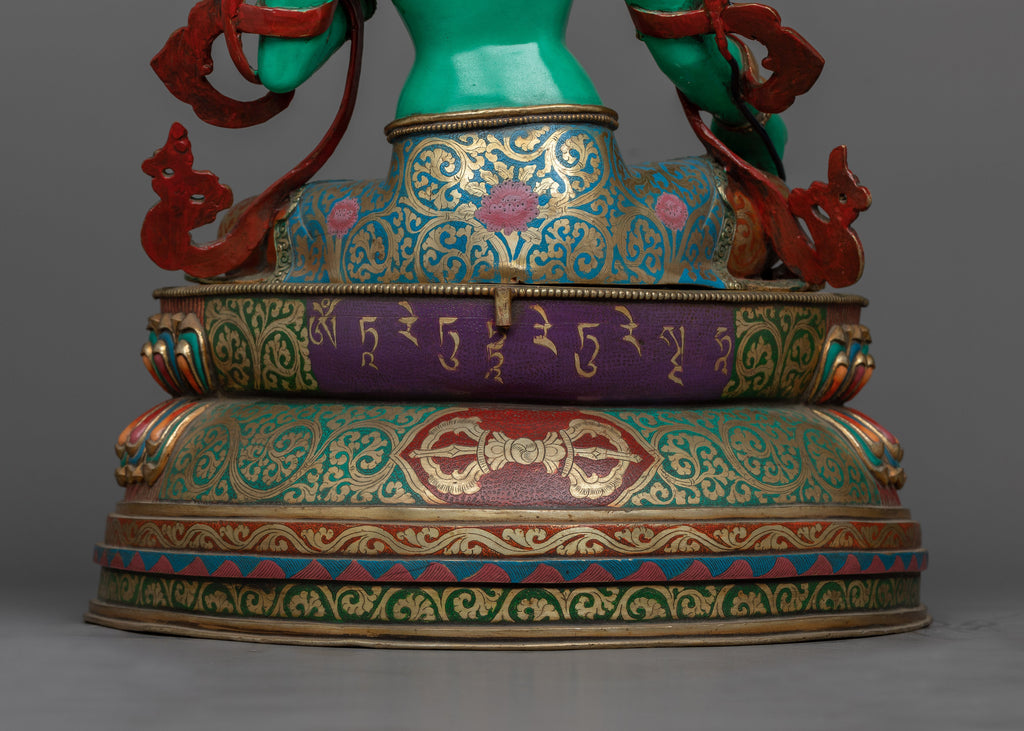 The magnificent Green Tara statue was created by knowledgeable craftspeople in Patan, Nepal. The statue's body is made of copper, guaranteeing its robustness and lifespan. Tara's enlightened nature is symbolized by the glorious brilliance added by the 24K gold gilding. Gold and acrylic paintings accentuate the minute details, emphasizing Green Tara's gentle features and calm demeanor. In keeping with Green Tara's original color, the statue is exquisitely painted in green acrylic, signifying her proactive compassion and willingness to assist those in need. Everything about this sacred piece—from the voluminous robes to the lotus pedestal—reflects the great care and skill that went into making it.