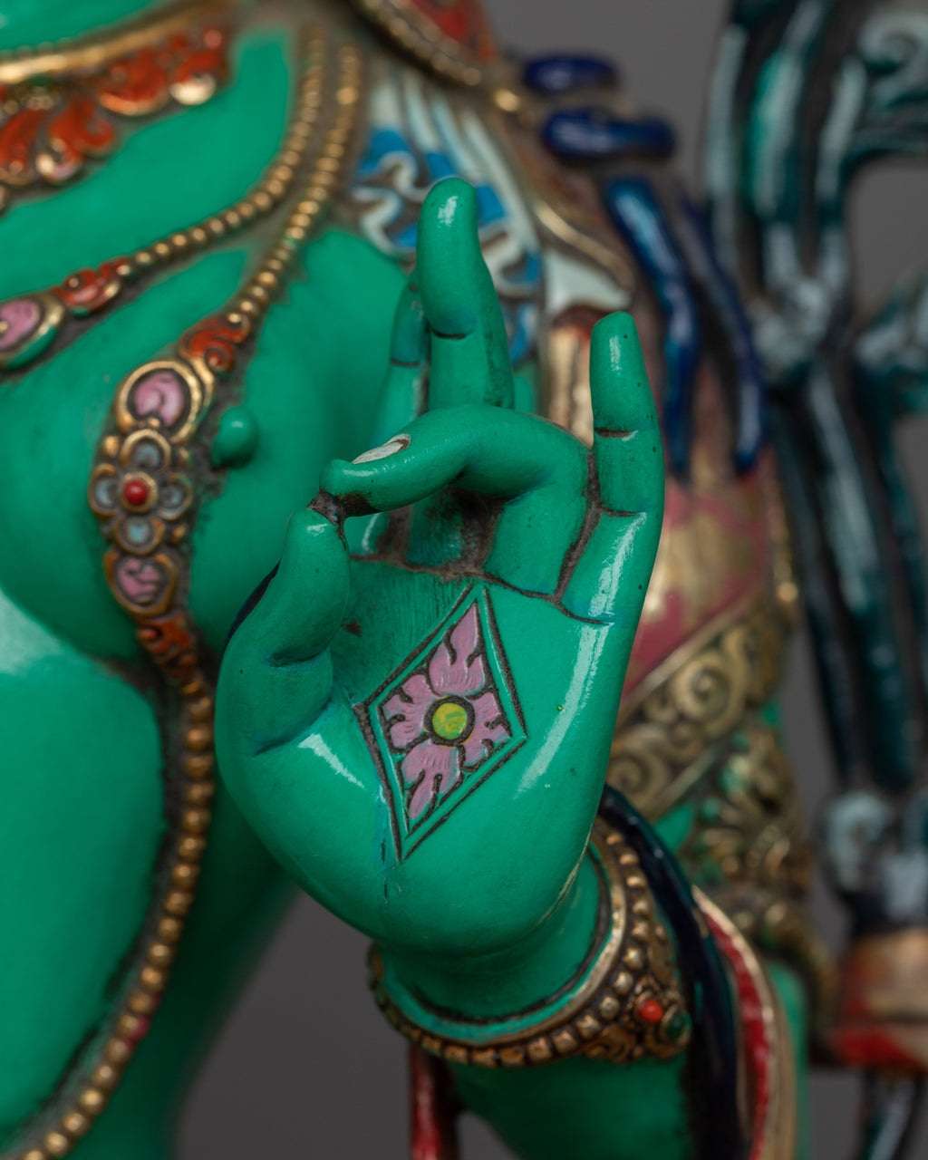 Green Tara, known as the “Mother of Liberation,” is a revered figure in Buddhism, embodying compassion and swift action. She is often depicted in a posture of readiness, symbolizing her vow to help all beings achieve enlightenment. Green Tara’s serene expression and open posture convey her boundless compassion and willingness to assist in overcoming obstacles and fears.