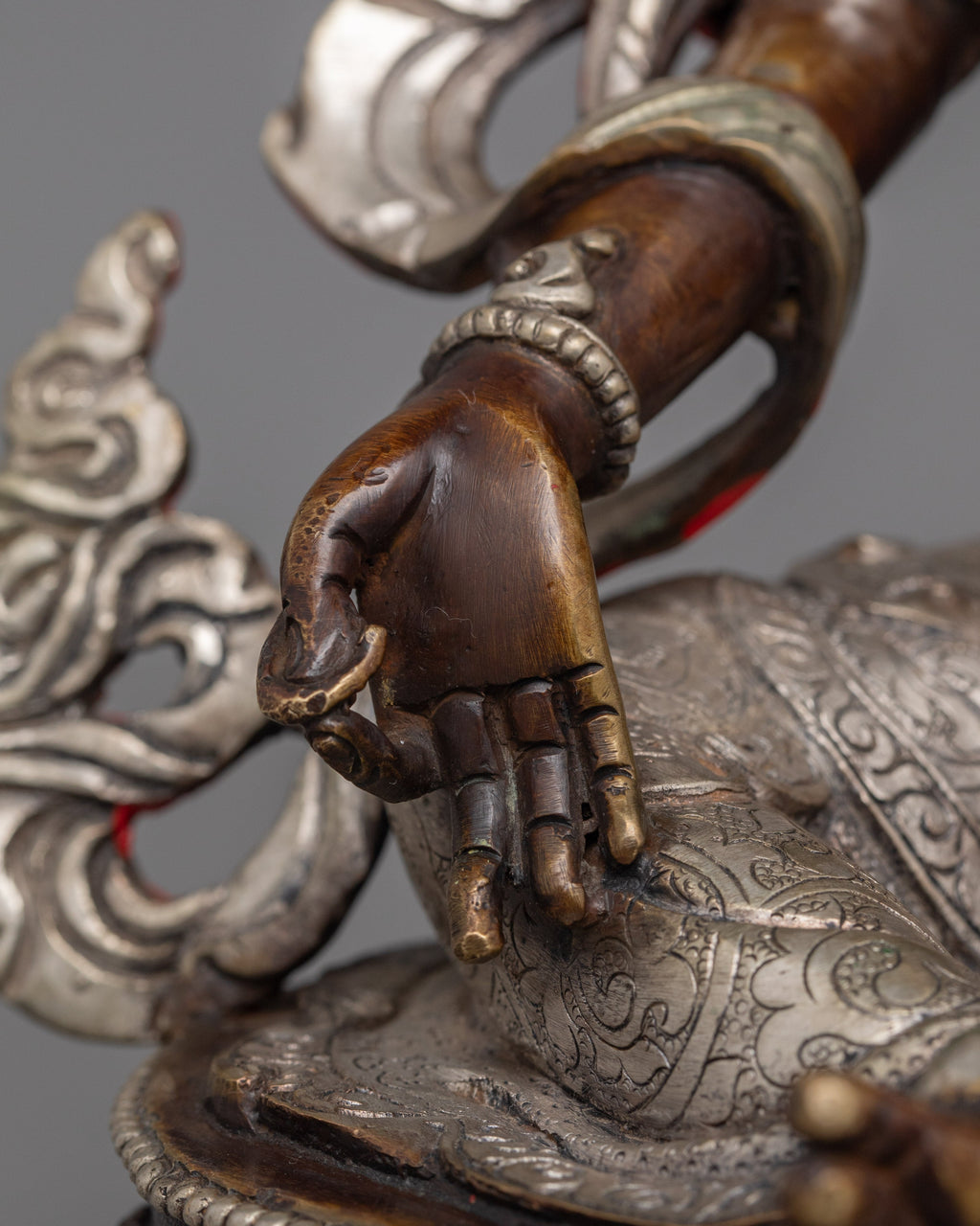As depicted, Green Tara is shown seated on a lotus throne with her right leg typically extended forward, signifying her active compassion and willingness to help. Her hands express profound meaning through their gestures, the right hand is displayed in the "gesture of giving" (Varada Mudra), symbolizing her boundless generosity and willingness to provide blessings. Meanwhile, her left hand delicately holds a blue lotus (Utpala), a symbol of purity and spiritual awakening, offering protection and reassurance to those who seek her guidance.