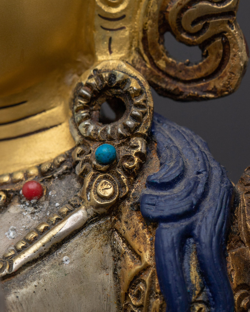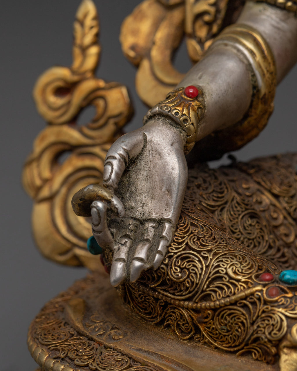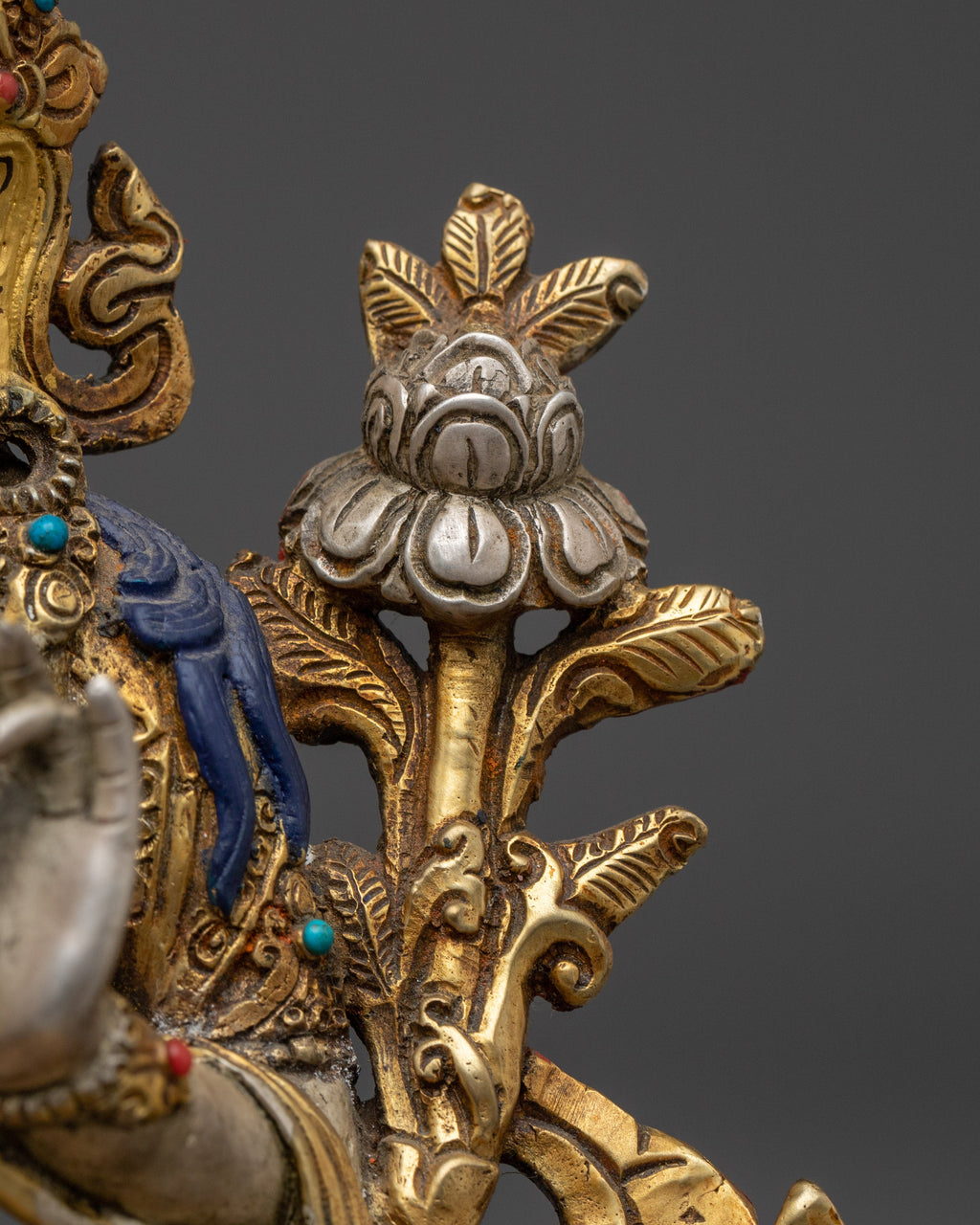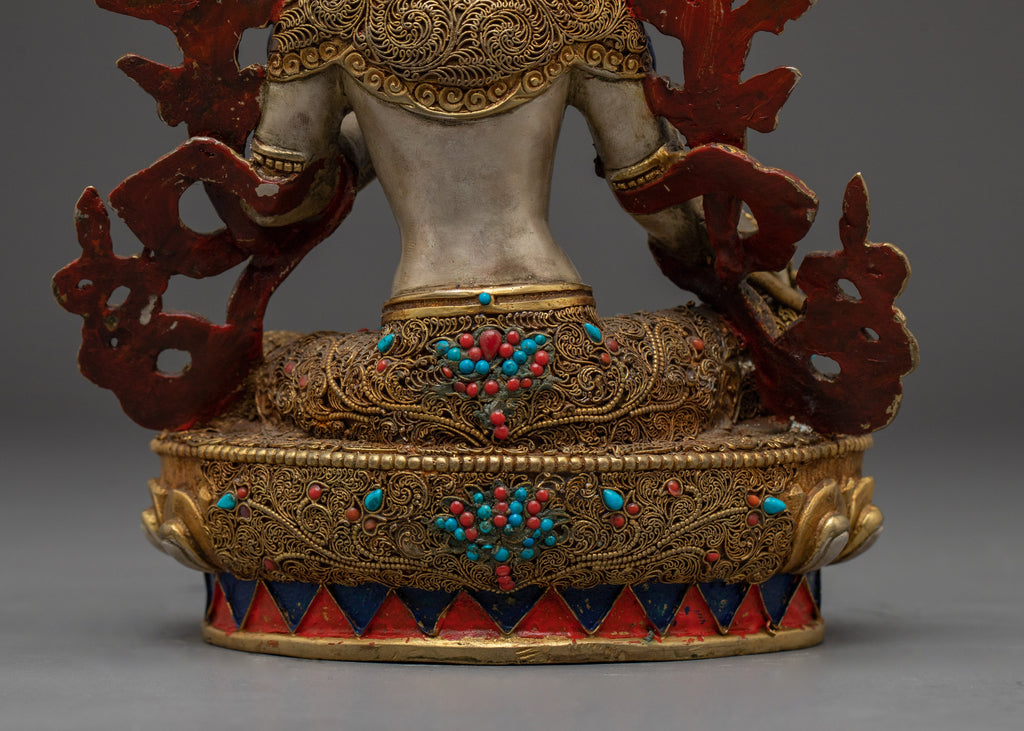 This Compassionate Green Tara Bodhisattva handmade statue measures 8.5”/21.5cm in height and 6.7”/17cm at the base, weighing 1.81 kg. Crafted from silver-colored metal with 24K gold gilding and gold & acrylic paintings, it reflects exquisite traditional craftsmanship. Expertly handcrafted by skilled Nepali artisans, it is a meaningful addition to altars, meditation spaces, or personal spiritual collections.