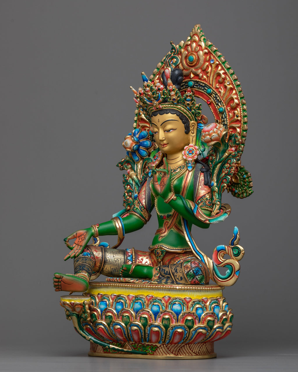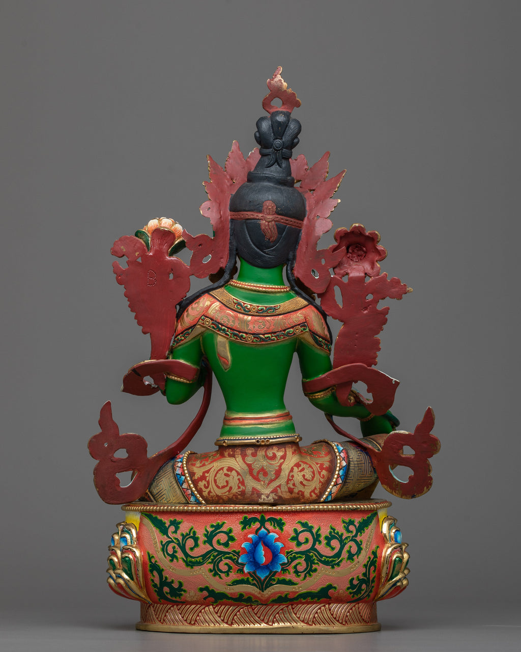 Green Tara is a powerful sign of protection, wisdom, and active compassion. The lively green color represents her eagerness to help those in need, while the pure gold face reflects her spiritual purity and knowledge. Every aspect of this statue, from her compassionate expression to her elegant posture, is designed to evoke a sense of peace and spiritual assurance.