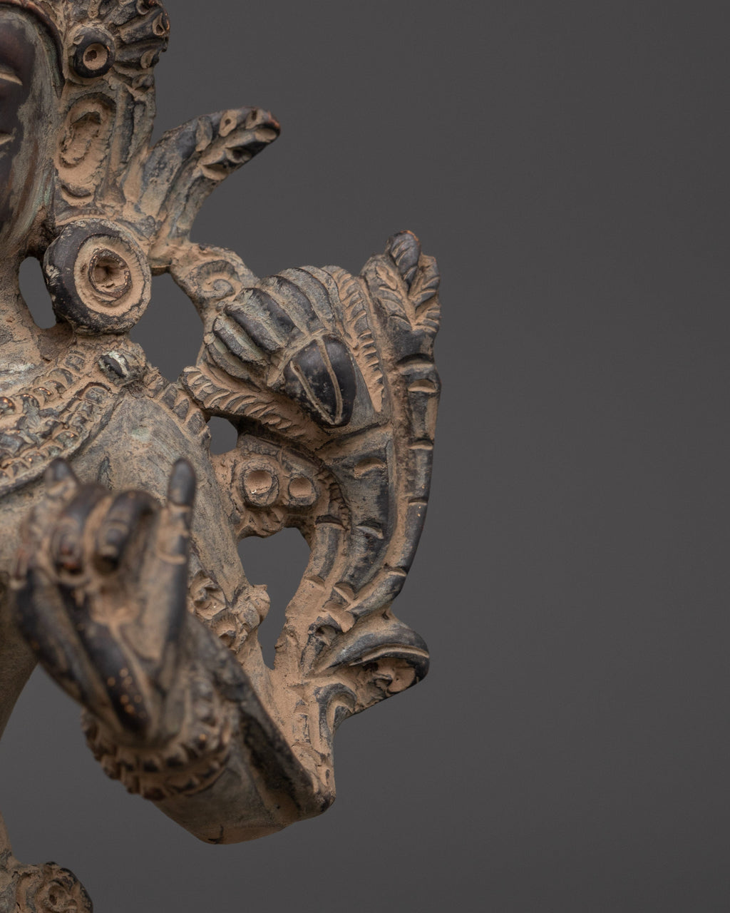 Green Tara, renowned as the swift liberator and mother of all Buddhas, is seen here in a poised pose of elegance and readiness, representing her duty as a defender and guide. The intricate engravings on her robes, flower embellishments, and lotus base highlight the artistry that brings her to life in this statue.