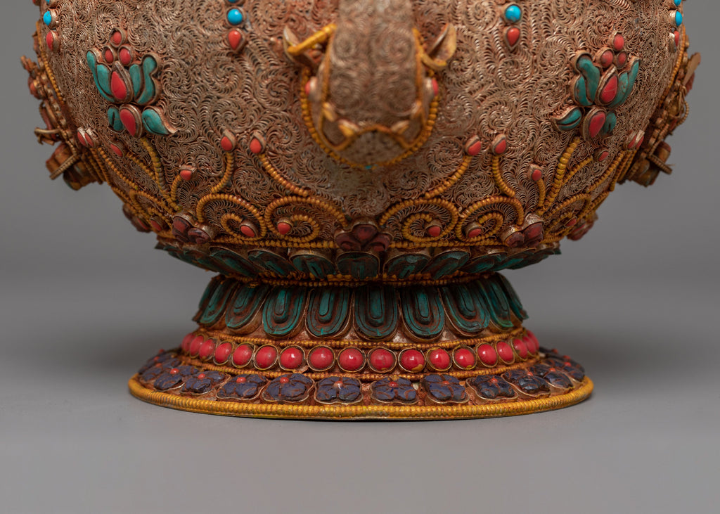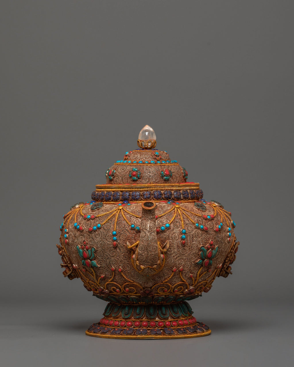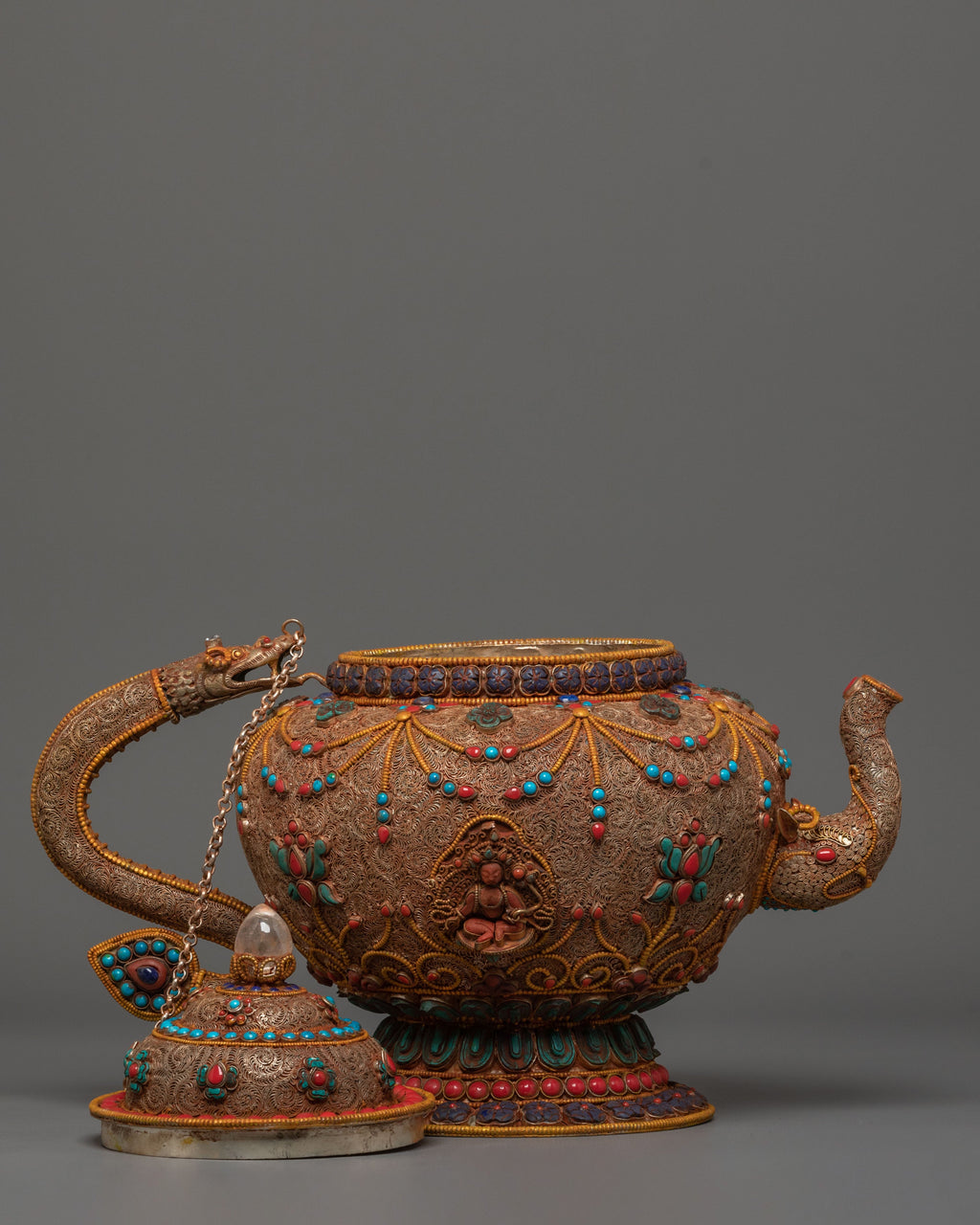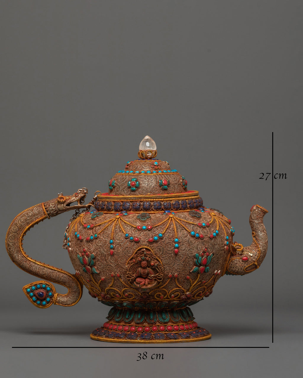 At the heart of its ornate design is the beloved Green Tara, the female Bodhisattva known as the "Mother of Liberation." She represents compassion, protection, and the speedy removal of impediments. Her portrait rests gracefully within a filigree medallion adorned with floral motifs and jewel-studded patterns, representing abundance and purity. The mythical dragon-shaped handle indicates power and protection, while the delicate curve of the spout reflects Tara's compassionate blessings. The lid is capped with a crystal-like finial, symbolizing Tara's purity and enlightenment for her devotees.