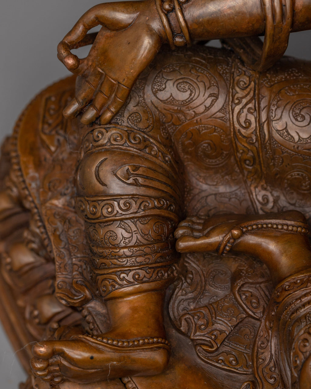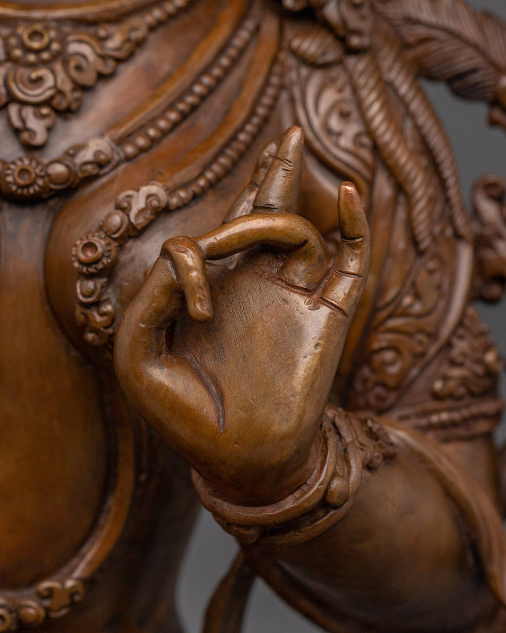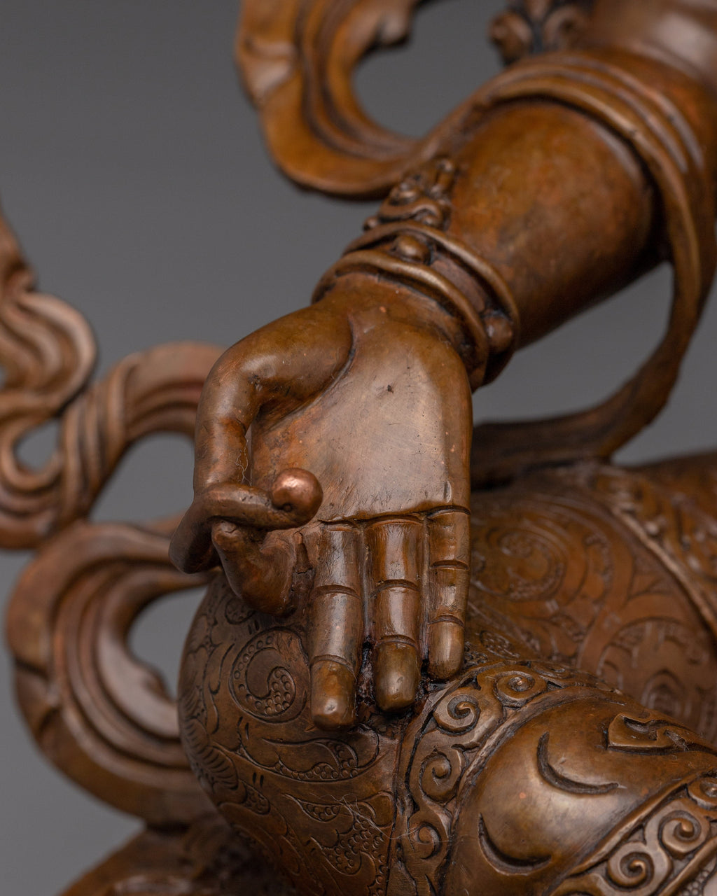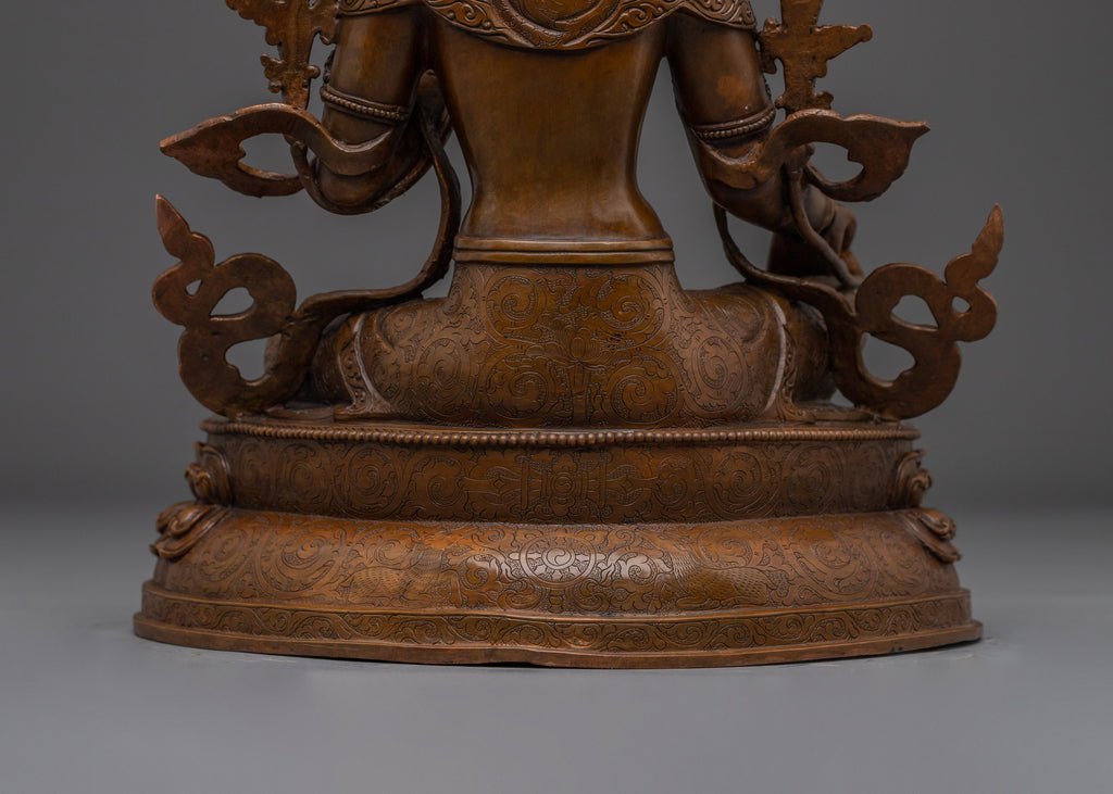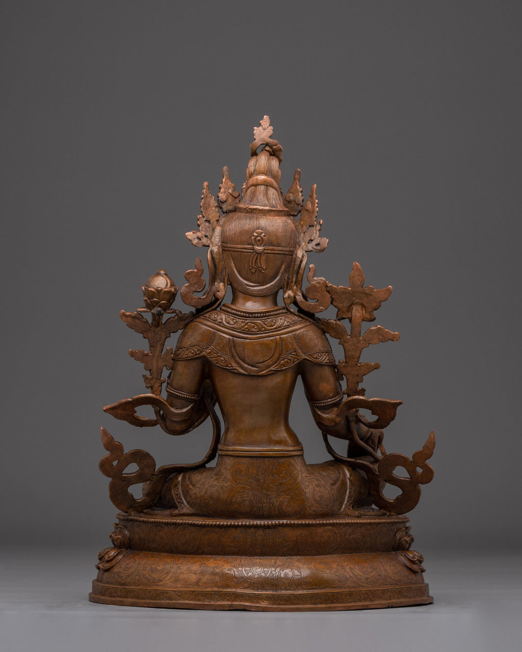 This 13.2-inch Green Tara Compassion Deity for Protection is an energetic representation of compassion, action, and protection. Handcrafted from oxidized copper by skilled artisans in Nepal, her body is beautiful yet powerful—seated in readiness with one leg extended, lotus flowers blooming at each shoulder, and a peaceful look exuding divine could be. The intricate design on her crown, robes, and mudras expresses profound regard and perfect craftsmanship.