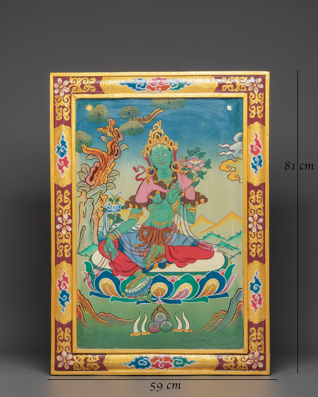 This Green Tara Deity Wall Hanging is a revered piece of Tibetan Buddhist art designed to evoke protection, compassion, and spiritual strength. This enormous and bright sculpture, which stands 81cm tall and 59cm wide, shows Green Tara, the venerated Mother of Liberation, who is recognized for her swift compassion and ability to eliminate fear and difficulties. This wall hanging is perfect for meditation rooms, shrines, or as a centerpiece for spiritual home decor. It carries the blessings of one of Buddhism's most cherished deities.