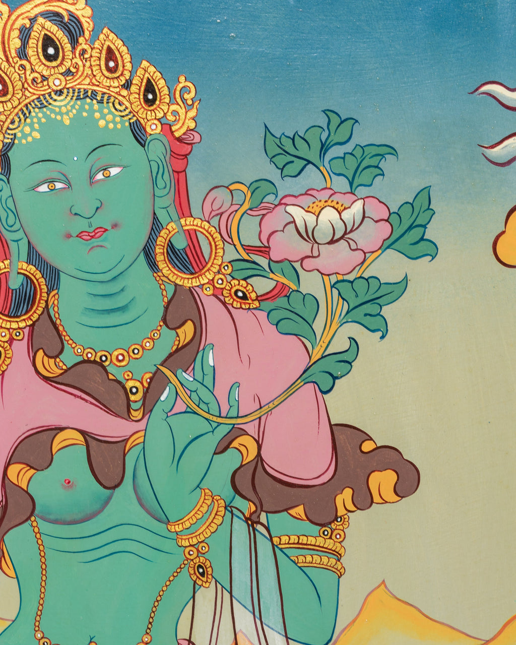 This Tibetan Buddhist wall hanging is more than just a gorgeous piece; it is a spiritual treasure that represents protection, compassion, and direction. Believers regard Green Tara as a quick savior who is always ready to answer devotees' cries in times of need. Placing this wall hanging in your house or shrine is thought to bring blessings, harmony, and spiritual energy into the place, making it ideal for practitioners, collectors, or anyone who is drawn to sacred art.