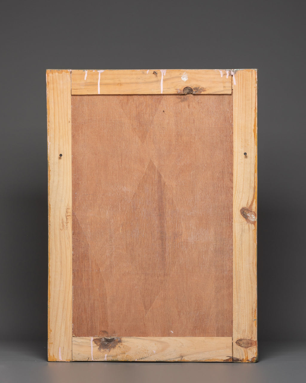 This wall hanging, created on a wooden foundation and hand-painted with exquisite acrylic colorings, exemplifies excellent workmanship. Green Tara is shown sitting gracefully on a lotus throne, indicating purity and enlightenment, and holding a flowering lotus flower, which denotes spiritual awakening. The detailed details, golden highlights, and brilliant color palette bring the holy image to life, conveying both cultural authenticity and profound spiritual significance. The richly designed frame with traditional Tibetan designs adds to the piece's spiritual aura.