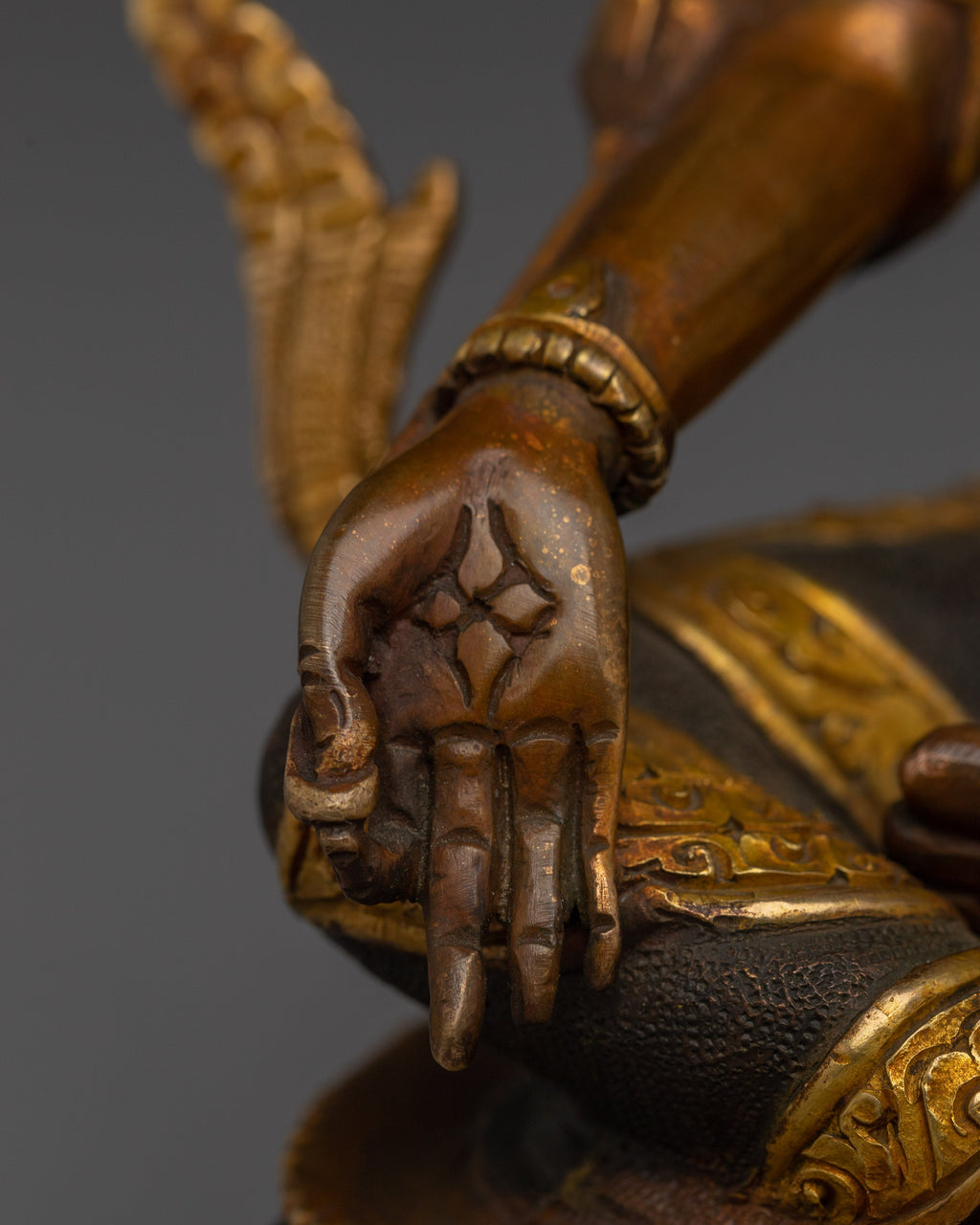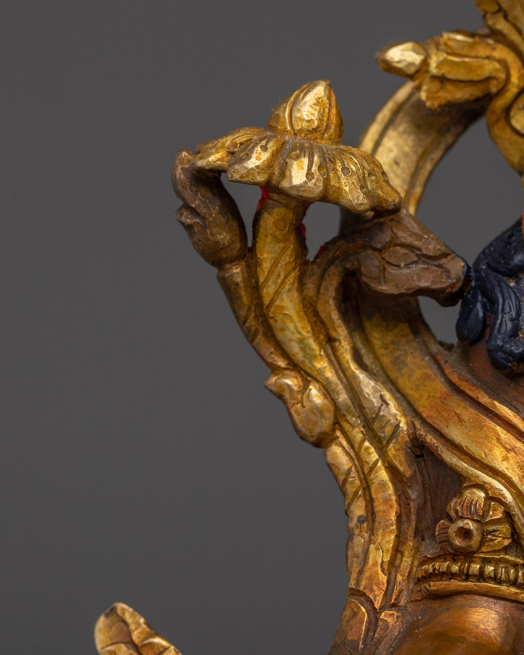 As depicted, Green Tara is shown seated on a lotus throne with her right leg typically extended forward, signifying her active compassion and willingness to help. Her hands express profound meaning through their gestures; the right hand is displayed in the "gesture of giving" (Varada Mudra), symbolizing her boundless generosity and willingness to provide blessings. Meanwhile, her left hand delicately holds a blue lotus (Utpala), a symbol of purity and spiritual awakening, offering protection and reassurance to those who seek her guidance.