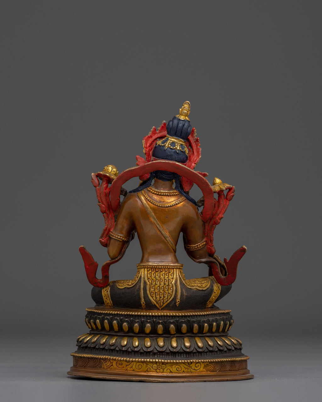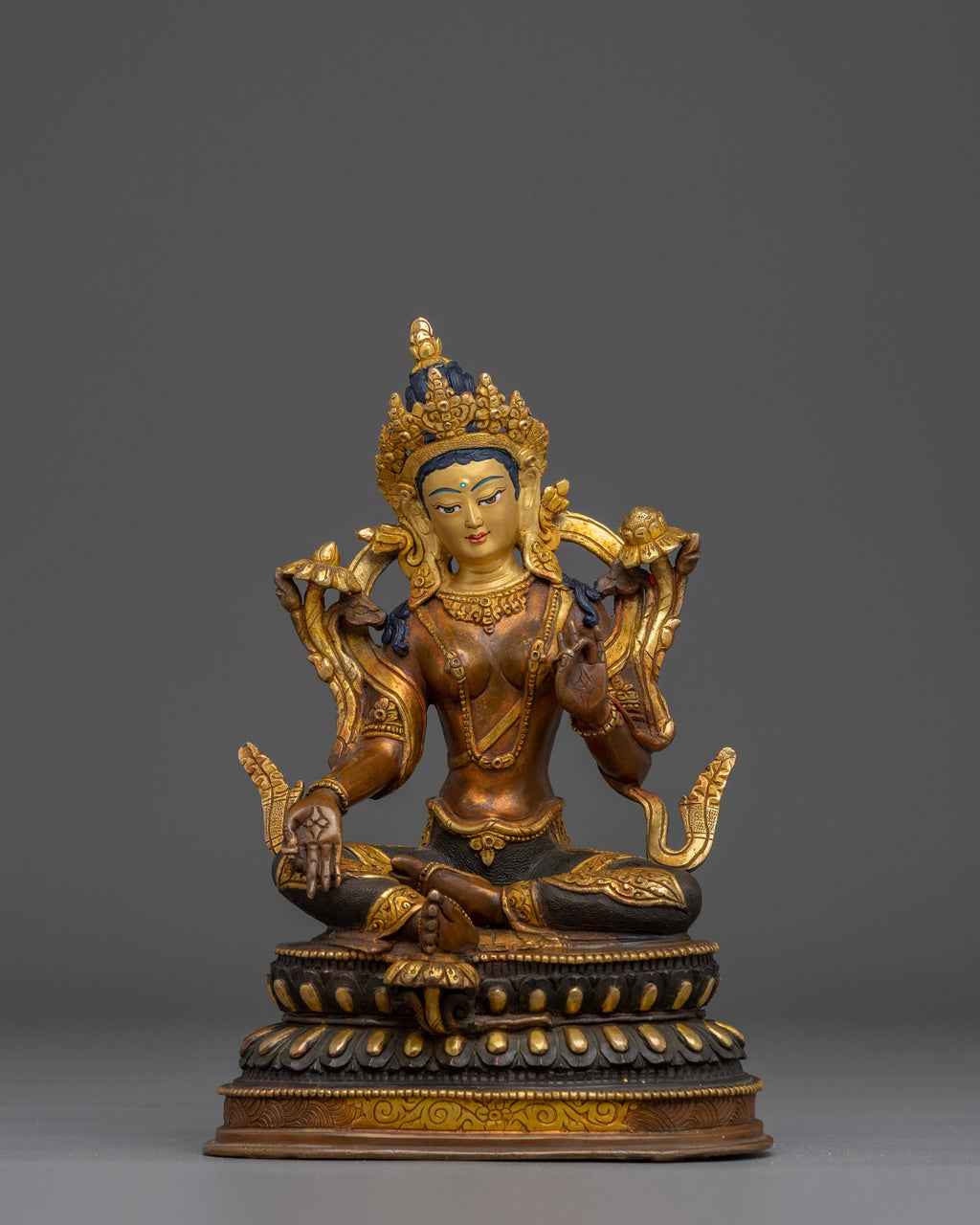 Green Tara, Female Bodhisattva stands at 9.4 inches (24 cm) in height with a base width of 6.3 inches (16 cm), and weighs approximately 2.16 kilograms. Made from a high-quality copper body, it is adorned with 24K gold gilding and detailed with vibrant gold and acrylic paintings. The fine craftsmanship highlights the serene expression and symbolic posture of Green Tara, making it a meaningful piece for spiritual spaces, altars, or meditation rooms. Its compact size makes it ideal for both personal shrines and decorative use, while the rich materials add a sense of elegance and sacred presence.