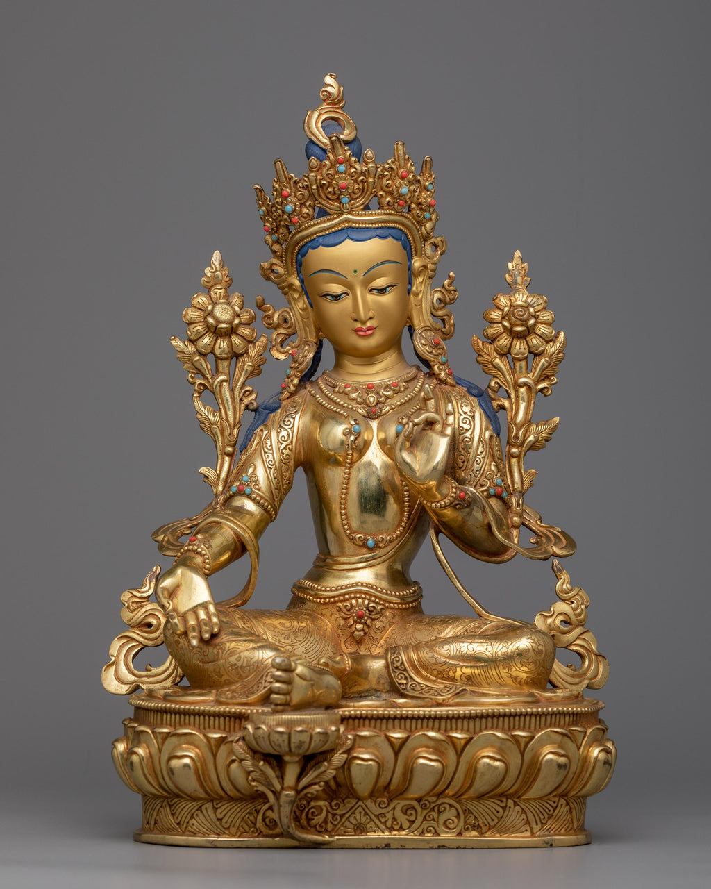 Green Tara, often known as the "Mother of Liberation," is a Mahayana Buddhist female Bodhisattva. She is recognized for her kindness, quick response to those who seek her assistance, and ability to conquer barriers and bring wealth. Green Tara is also known as a guardian, assisting people in overcoming their fears and concerns. This statue represents her loving and protective character, inviting serenity, wealth, and protection into your environment.