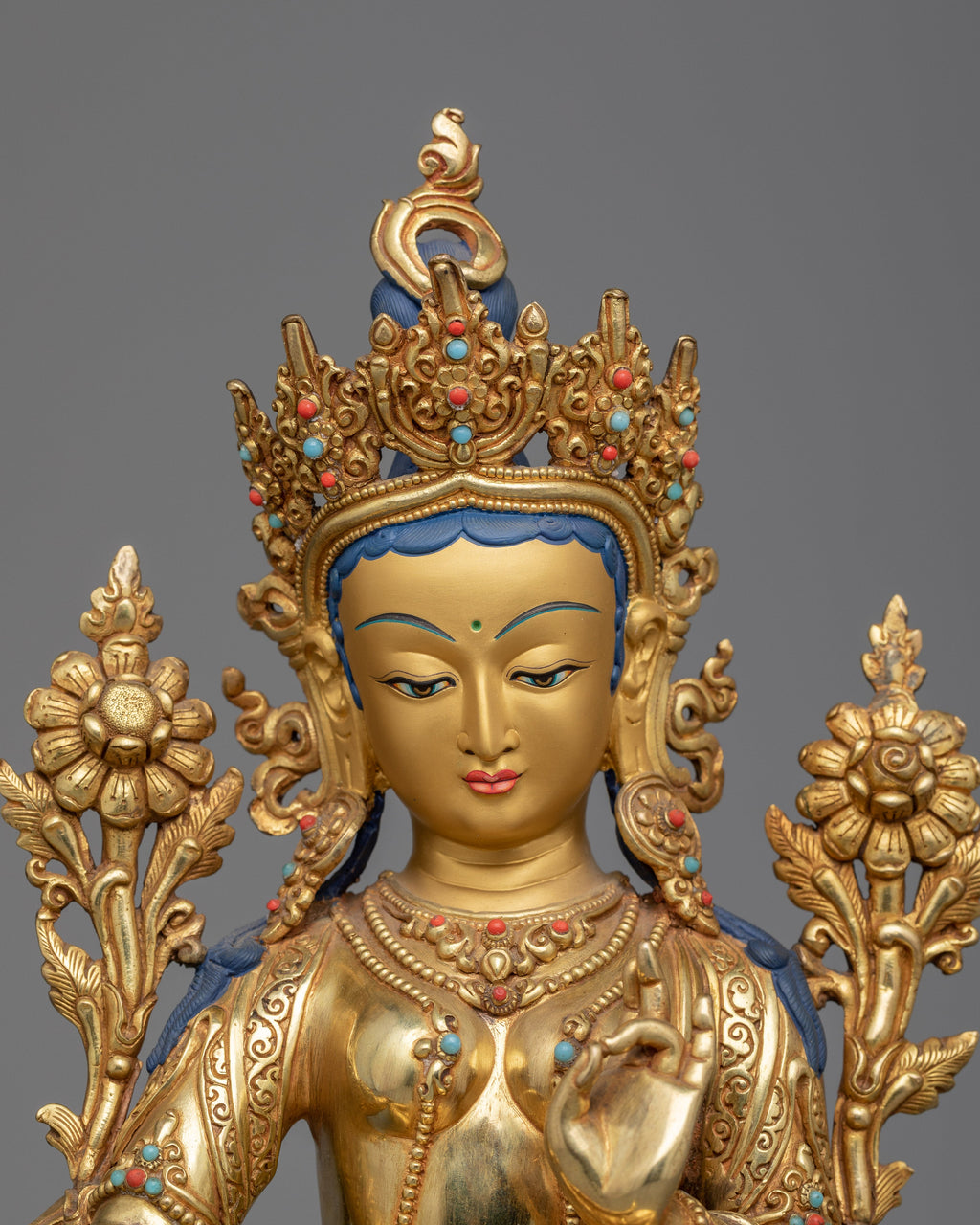 With our Green Tara Figurine, you may welcome the personification of compassion into your home. With a height of 12.7 inches and a base of 8.6 inches, this statue is ideal for your home, shrine, or meditation place. The statue is made of copper, gilded with 24k gold, and ornamented with 24k gold and acrylic paintings, symbolizing Nepalese craftsmanship's rich legacy.