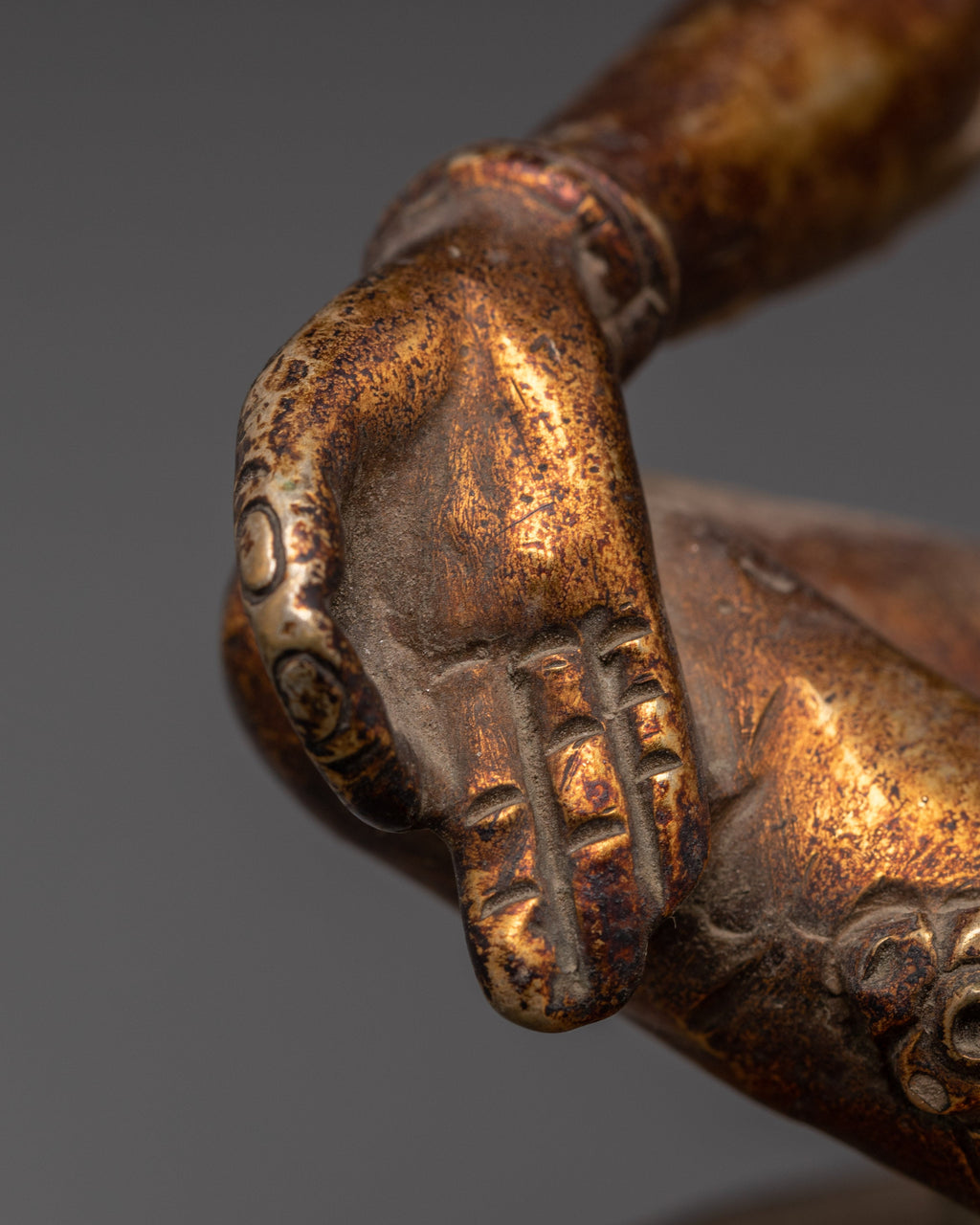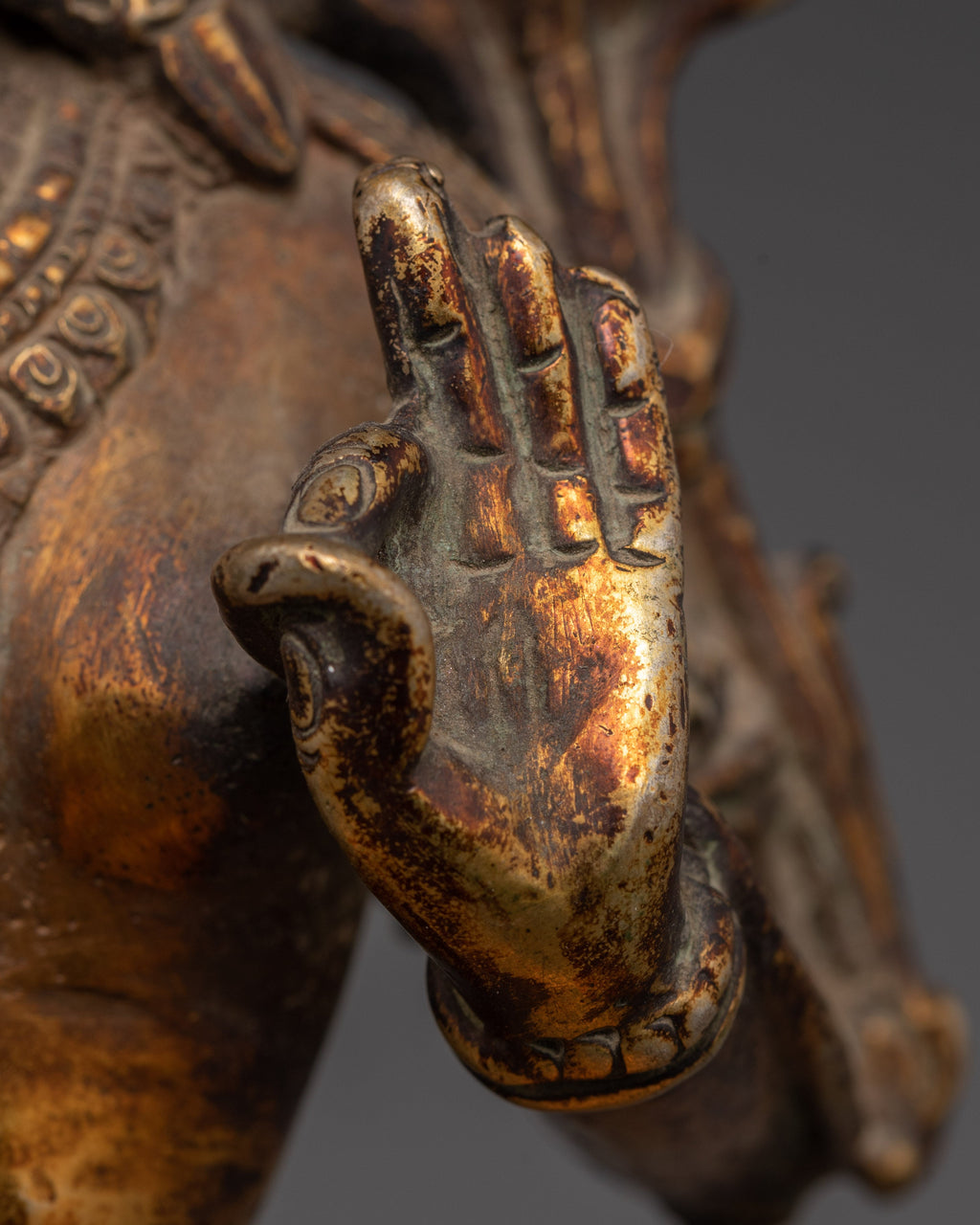 The artisan’s craftsmanship gives life to every detail: Tara’s crown, her flowing robes, and the open lotus beneath her hand are delicately engraved and polished with care. The gold-plated embellishments highlight her divine aura, symbolizing enlightenment and purity. The oxidized copper base provides a grounding presence, representing stability and the deep roots of Buddhist tradition. This statue is more than an artistic creation—it is a spiritual object meant to inspire meditation, devotion, and peace. Whether placed on an altar, shrine, or meditation corner, it radiates an energy of compassion and calmness that enriches any sacred space.