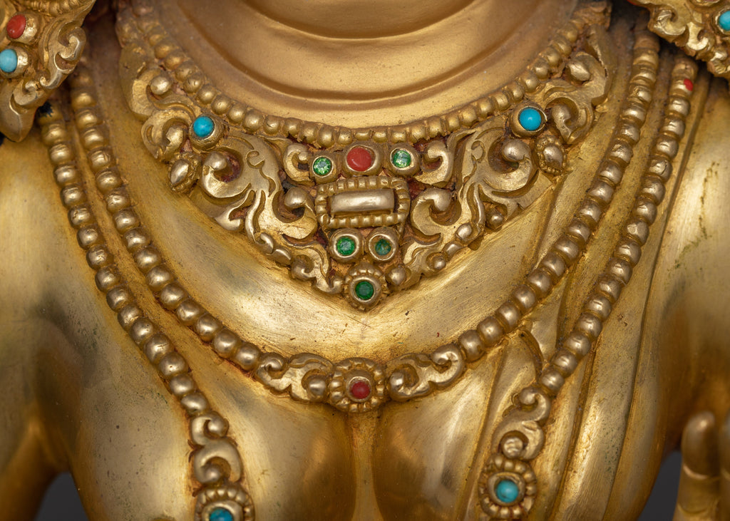 This stunning 18.3" (46.5 cm) statue of Green Tara gold gilded compassionate deity, one of Tibetan Buddhism's most respected symbols, symbolizes compassionate action and protection. Tara is shown in her timeless semi-lotus posture (lalitasana), with one leg outstretched to represent her readiness to rise and assist those in need. The statue, made of copper and gilded with triple layer of 24K gold, and deeply engraved carvings weighing 8.72 kg has been adorned with gold and acrylic paints that depict the minute details of this appreciated deity. Tara's right hand is in the varada mudra, a boon-granting gesture representing her boundless compassion, and her left hand is in the abhaya mudra, which provides protection and strength to those seeking refuge.