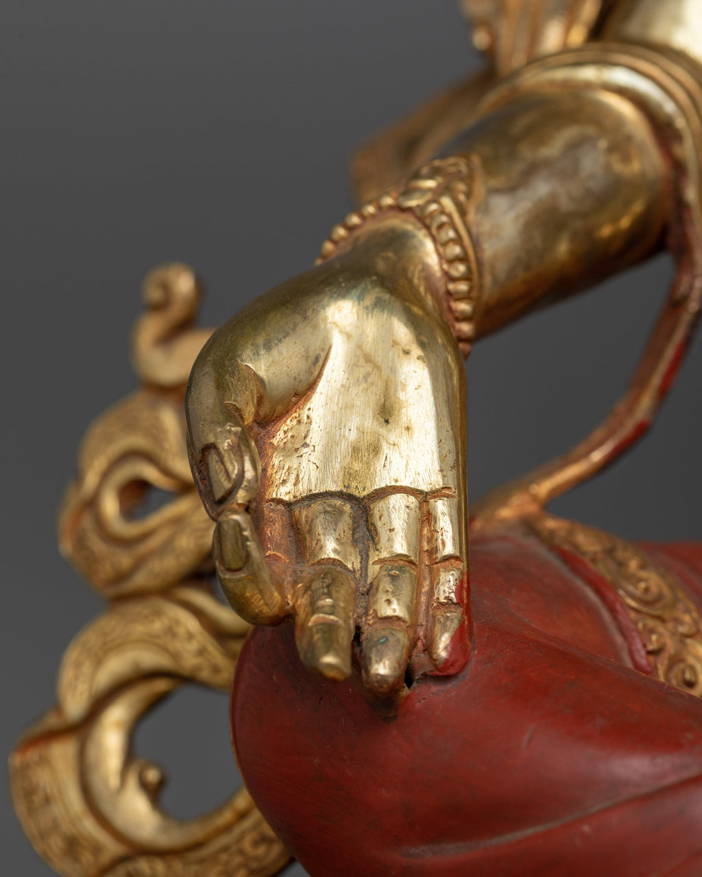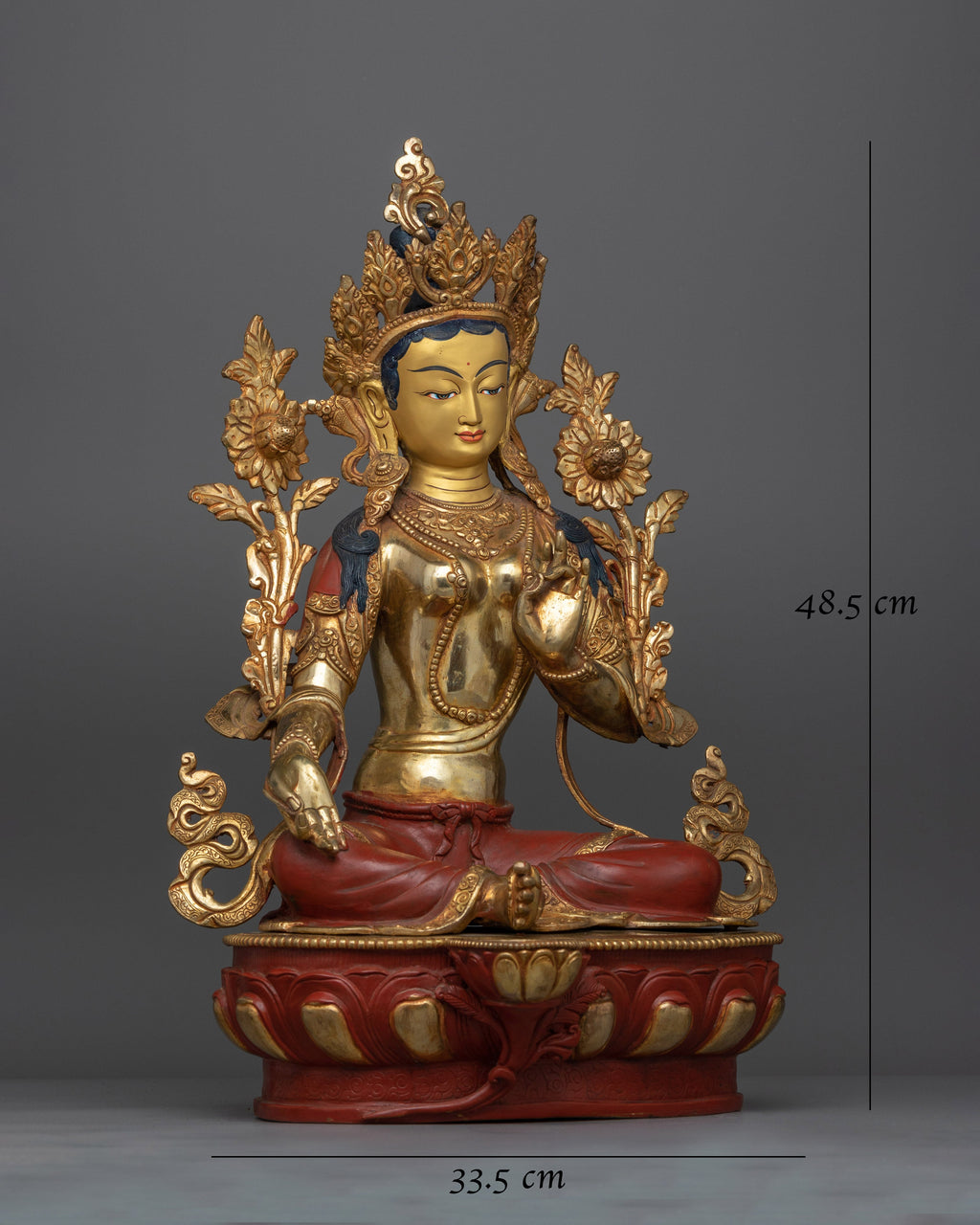 This beautiful Green Tara Gold Gilded Oxidized Statue, a tribute to the amazing artistry of Patan's talented artisans, will enhance your surroundings. This statue, which stands 48.5 cm tall, is carefully decorated with 24K gold gilding, acrylic and gold paintwork, and an oxidized copper body. Everything about Green Tara is well-made and artistically rendered, from the complex patterns on her clothing to the calm smile on her face.