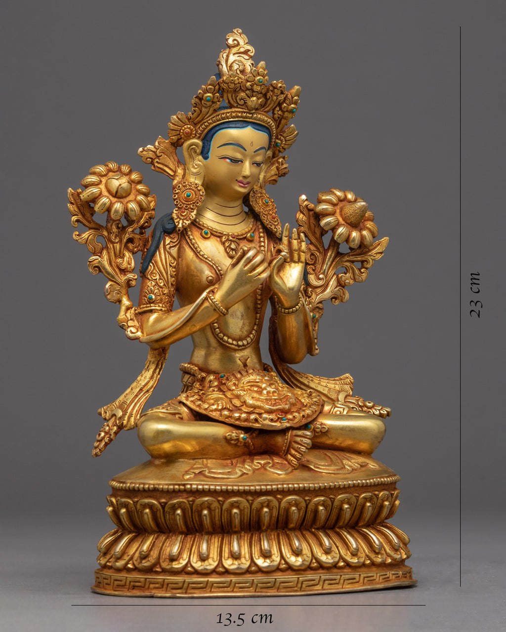 We handmade the beautiful gold sculpture, Green Tara, in the traditional Himalayan Art of Nepal. We have depicted her sitting on the moon disc of a lotus seat with a peaceful expression holding a full-blown utpala in both hands. Both hands are in Dharmachakra mudra, a gesture of teaching. Our craftsmanship in sculpting figurines of such deities has been passed down through generations. We used copper to mold the body and genuine 24 Karat gold to glide it.