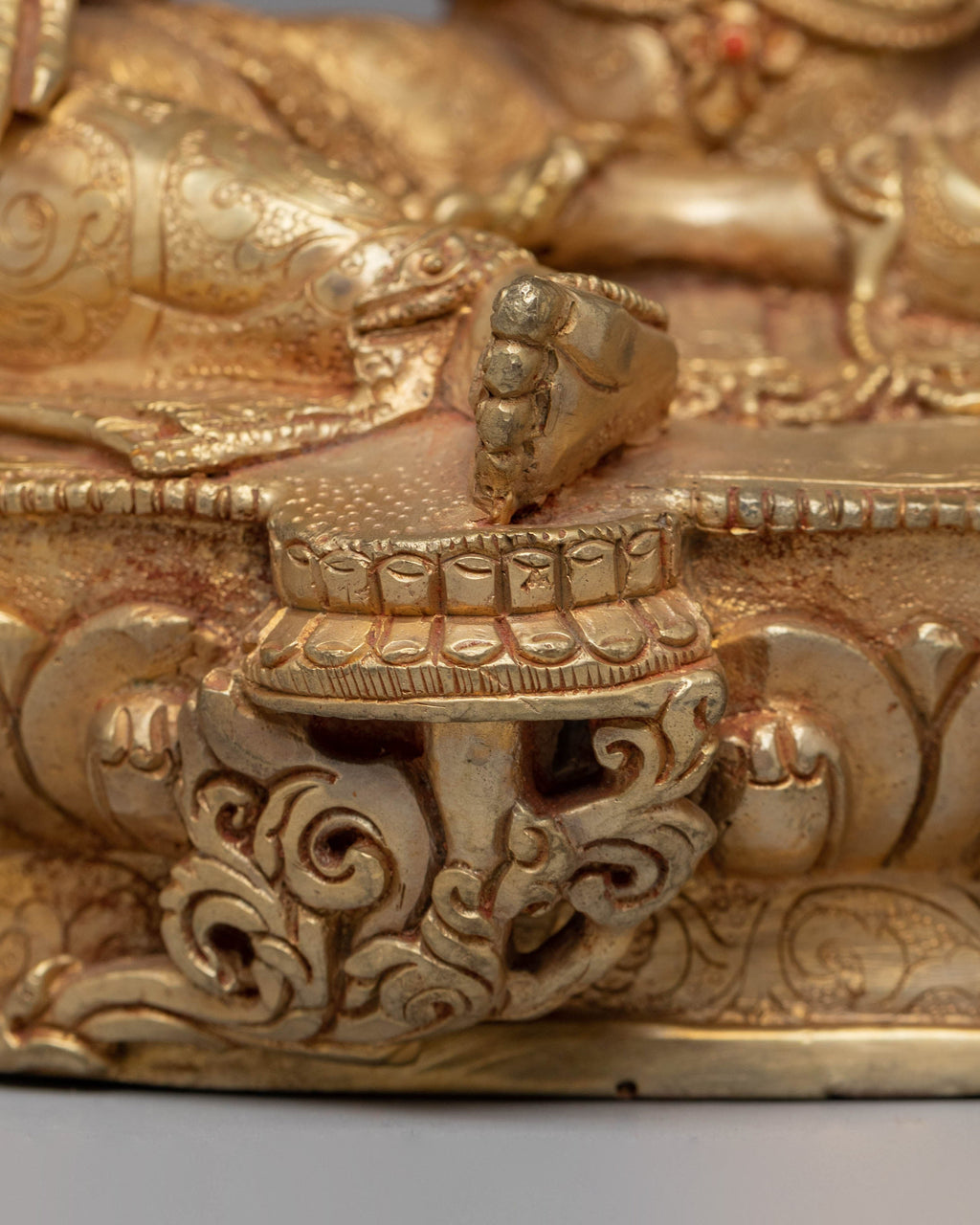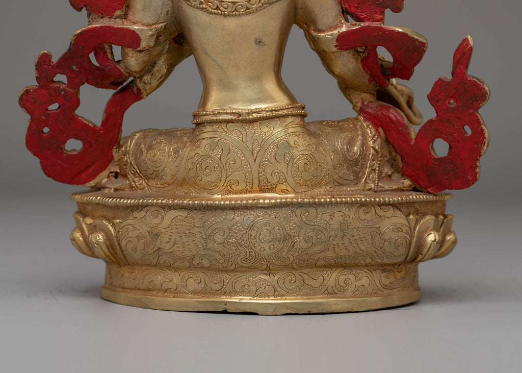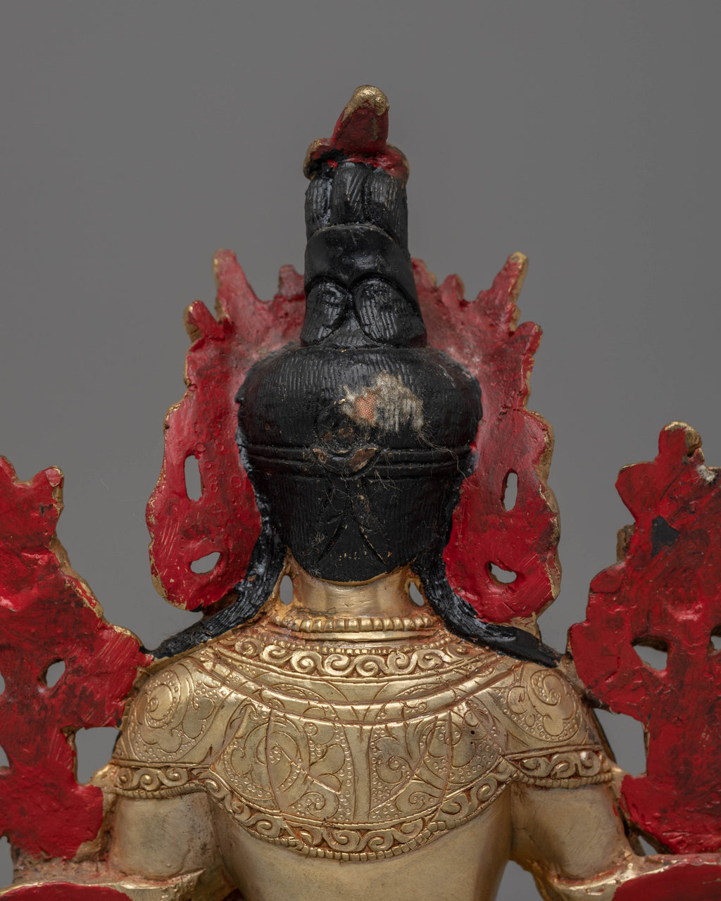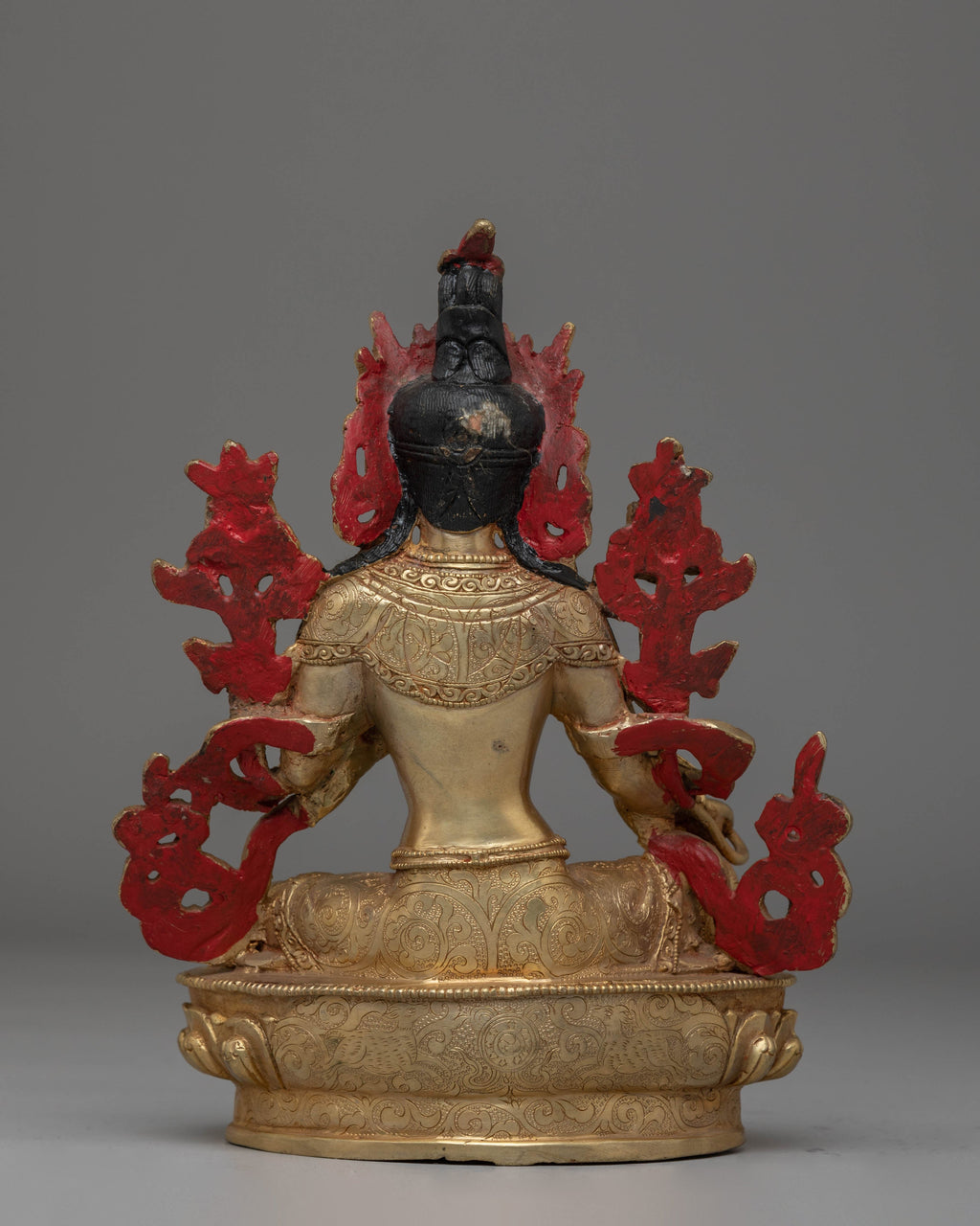 The Green Tara Handcrafted Copper Statue is a stunning representation of Tara, the female Bodhisattva of compassion, known for her swift assistance and healing powers. Standing at 22 cm in height and 18 cm in width, and weighing 1.65 kg, this beautifully crafted statue is made from a copper body and enhanced with 24K gold gilding. The addition of turquoise and coral artificial stones highlights the vibrant beauty and spiritual significance of the piece. This statue embodies the qualities of compassion, protection, and the power to overcome obstacles, making it an ideal addition to any altar or meditation space.