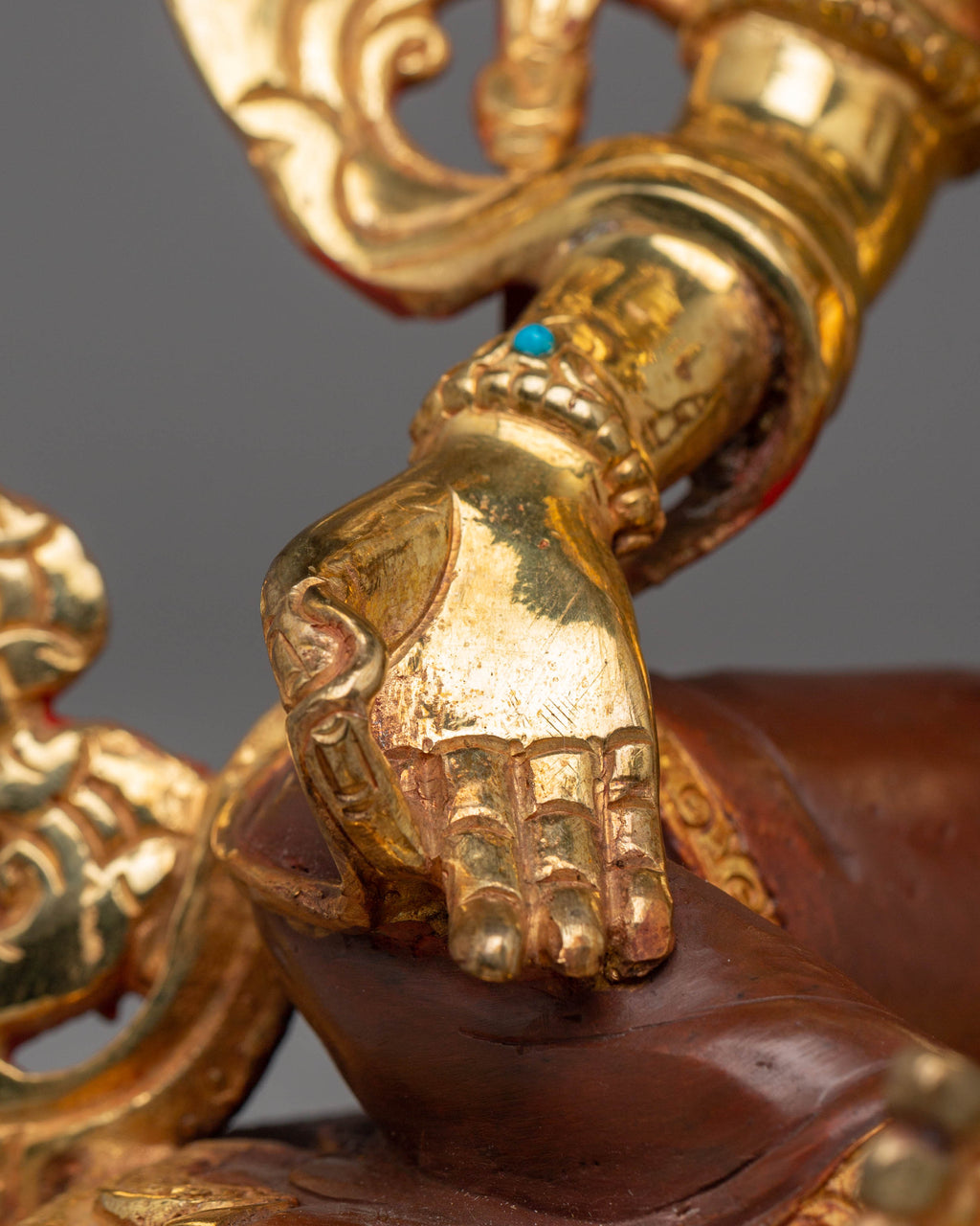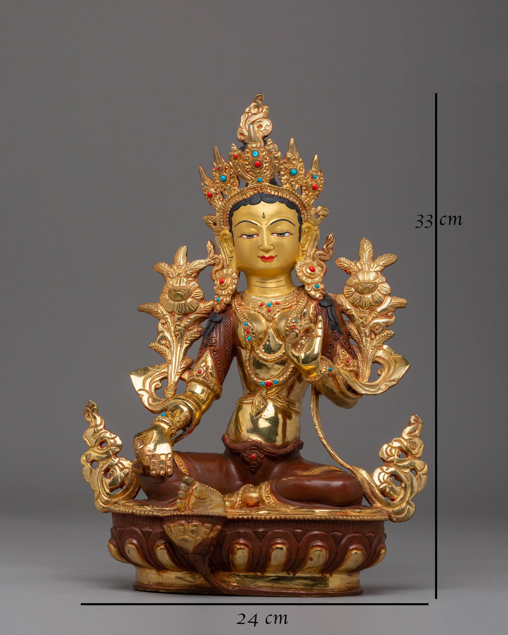 Green Tara, the revered Goddess Protector from suffering and obstacles, is beautifully represented in a carved statue. The piece, which stands 33 cm tall and has a base width of 24 cm, depicts Tara, who is recognized for taking quick action to help beings overcome fear and pain. This statue is composed of copper with 24K gold gilding. Acrylic color is used to highlight her compassionate expression. The craftsmanship reflects Green Tara's sacred presence, filling your area with spiritual protection and peace.