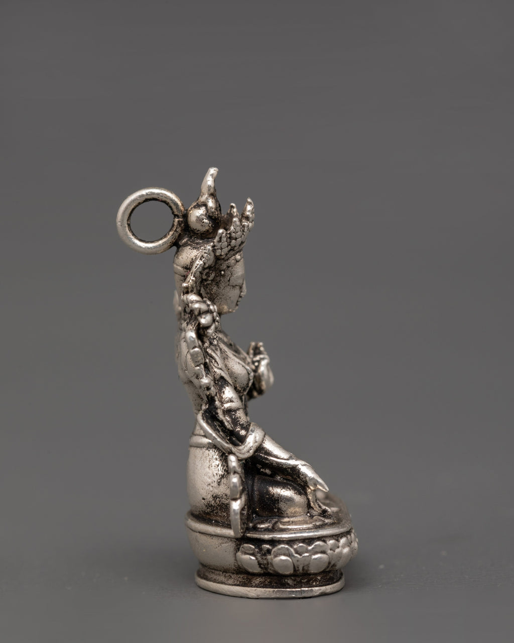 This Green Tara in Dhyana Mudra Locket Pendant is a stunning piece of Tibetan goddess jewelry representing the strong energies of compassion, protection, and healing. This sacred pendant is 98% silver and measures 2.9 cm in height and 1.9 cm in width. It features Green Tara, the venerated goddess of compassion and liberation in Tibetan Buddhism. She is depicted in the tranquil Dhyana mudra, sitting gently on a Lotus Moon Disc, symbolizing purity, spiritual awakening, and the path to enlightenment. Her presence instills peace and protection, making this an essential item for anybody on a spiritual path.