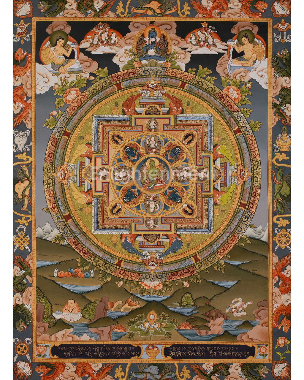 It features detailed concentric circles, palace gates, sacred symbols, and guardian figures, symbolizing order, harmony, and enlightened energy. Celestial beings are shown in the upper sections, while symbolic landscapes and offerings occupy the lower parts, anchoring the mandala in both cosmic and earthly realms. Perfect for meditation, altar display, or as a meaningful collector’s item, this thangka encourages reflection on compassion in its fullest and most vibrant form—an inspiring piece for practitioners, collectors, or anyone captivated by the timeless beauty of Buddhist sacred art.