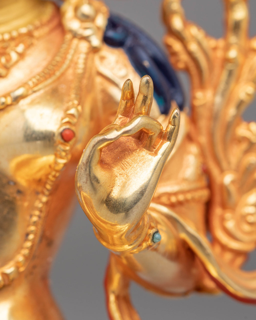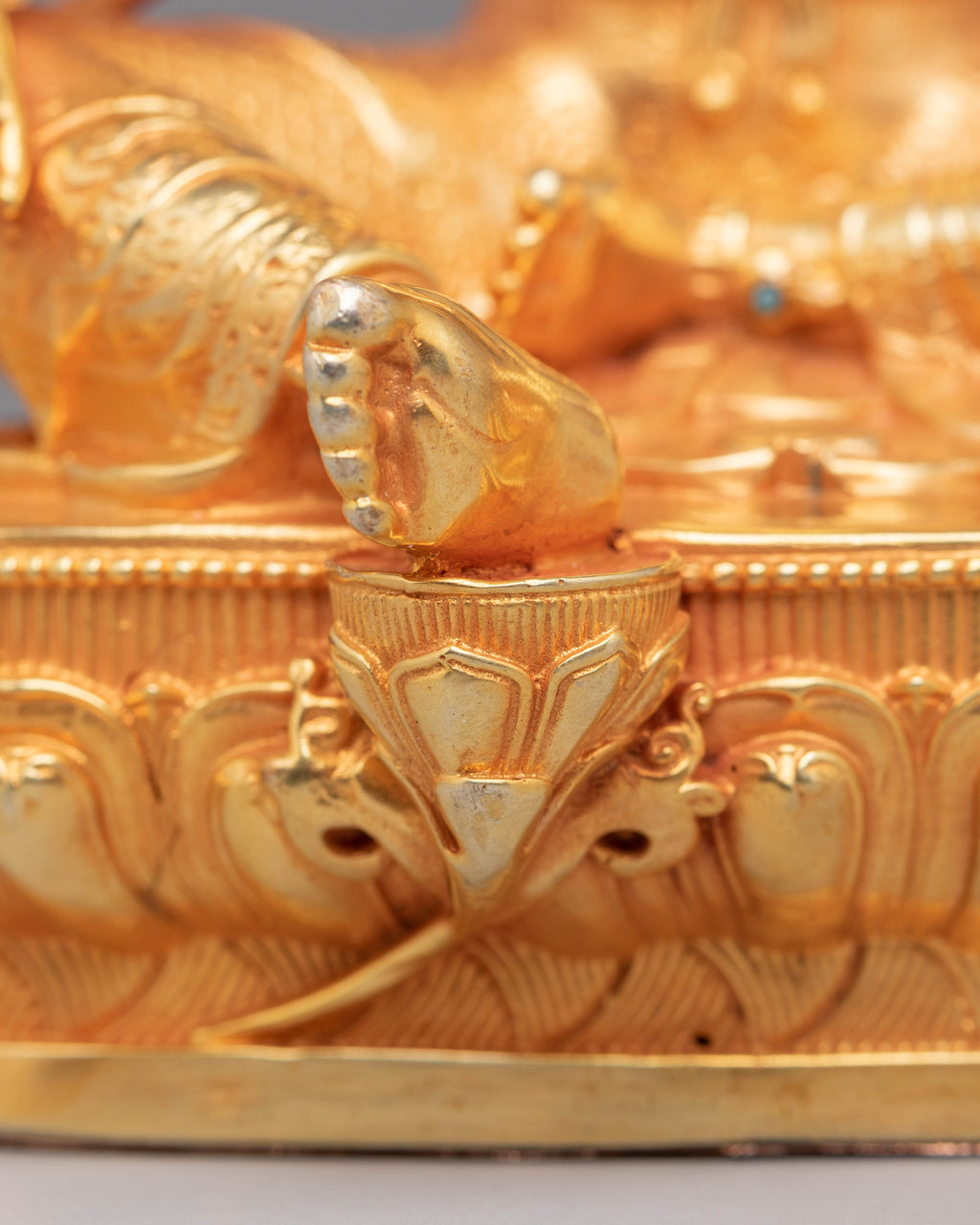The intricate craftsmanship of this statue highlights Green Tara's serene expression, adorned with gemstones that enhance her divine beauty. The 24K gold plating adds a luxurious touch, while the copper body ensures durability. This Green Tara statue serves as both a beautiful decorative piece and a powerful tool for meditation, fostering compassion, healing, and protection. Whether placed on an altar, in a meditation room, or used as a focal point in your home, it brings positive energy and spiritual blessings to your space.