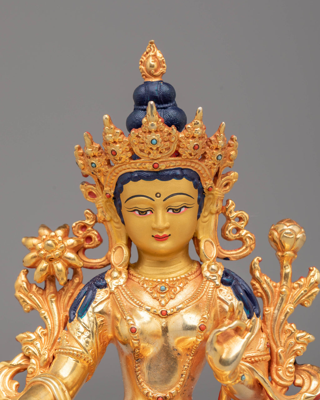 The Green Tara Meditation Statue is a beautiful representation of the revered Tibetan goddess known for her swift compassion and protection. This statue measures 17 cm in height and 14 cm in width, weighing 0.77 kg, and is crafted from a copper body with exquisite 24K gold plating and delicate acrylic color detailing. Green Tara is depicted seated gracefully on a lotus throne, symbolizing purity and enlightenment, with her right leg extended, signifying her readiness to help those in need. Her gentle yet powerful presence makes this statue a perfect addition to any meditation space or altar, inviting peace, compassion, and spiritual guidance into your home.