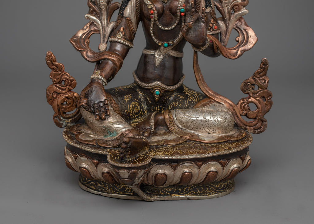 This Green Tara Protective Deity Figurine in Buddhism represents protection, healing, and spiritual enlightenment. This handcrafted statue, which measures 13.2" (Height) x 9.4" (Base) and weighs 2.47 kg, is made of oxidized copper and has a durable and spiritual appeal. Crafted by expert artisans, this item symbolizes the rich traditions of Himalayan Buddhism, making it an important addition to altars, meditation places, or holy collections.