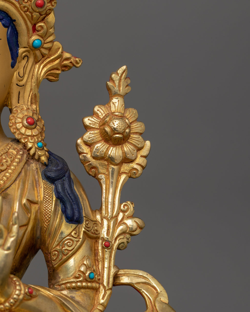 As depicted, Green Tara is shown seated on a lotus throne with her right leg typically extended forward, signifying her active compassion and willingness to help. Her hands express profound meaning through their gestures, the right hand is displayed in the "gesture of giving" (Varada Mudra), symbolizing her boundless generosity and willingness to provide blessings. Meanwhile, her left hand delicately holds a blue lotus (Utpala), a symbol of purity and spiritual awakening, offering protection and reassurance to those who seek her guidance.