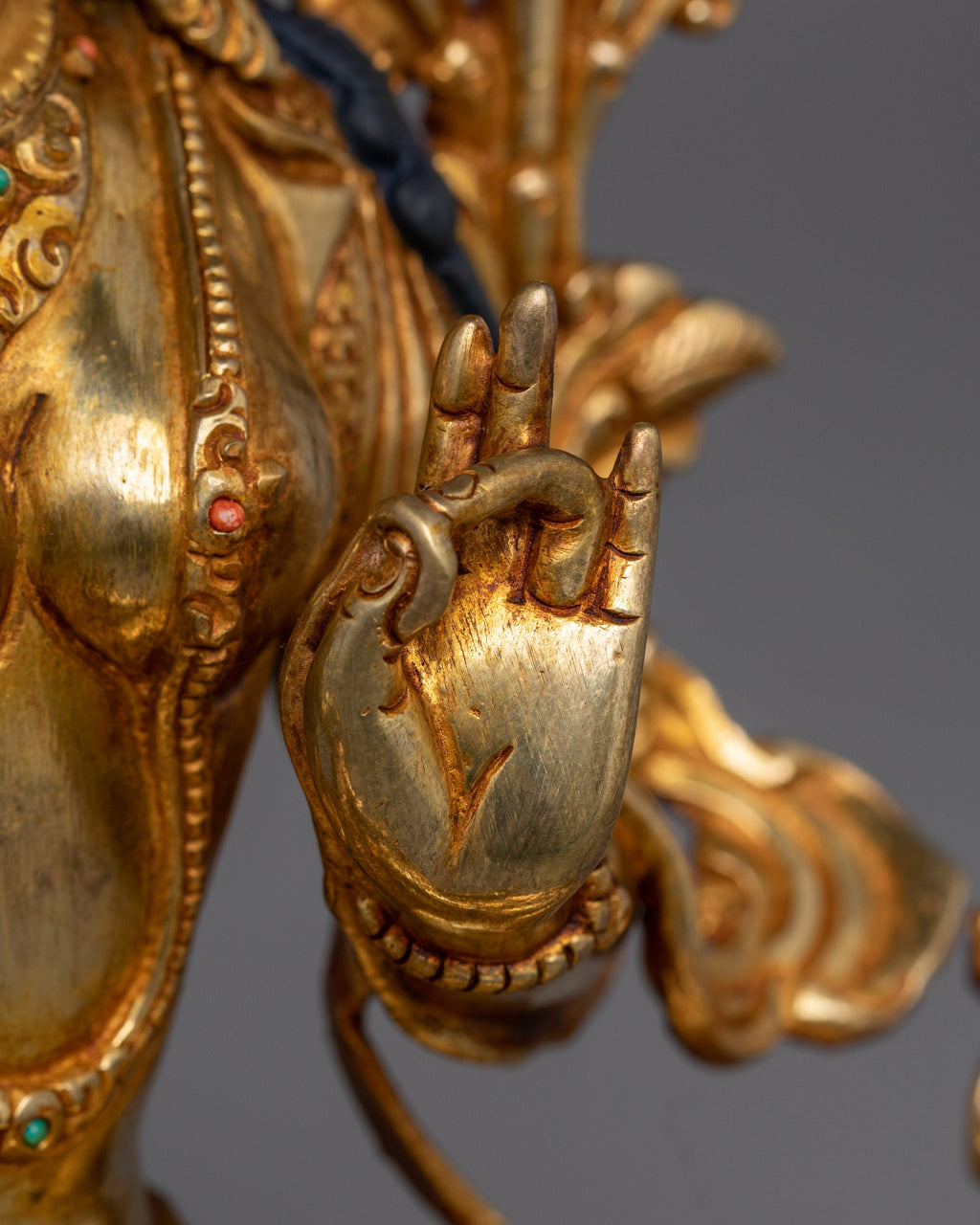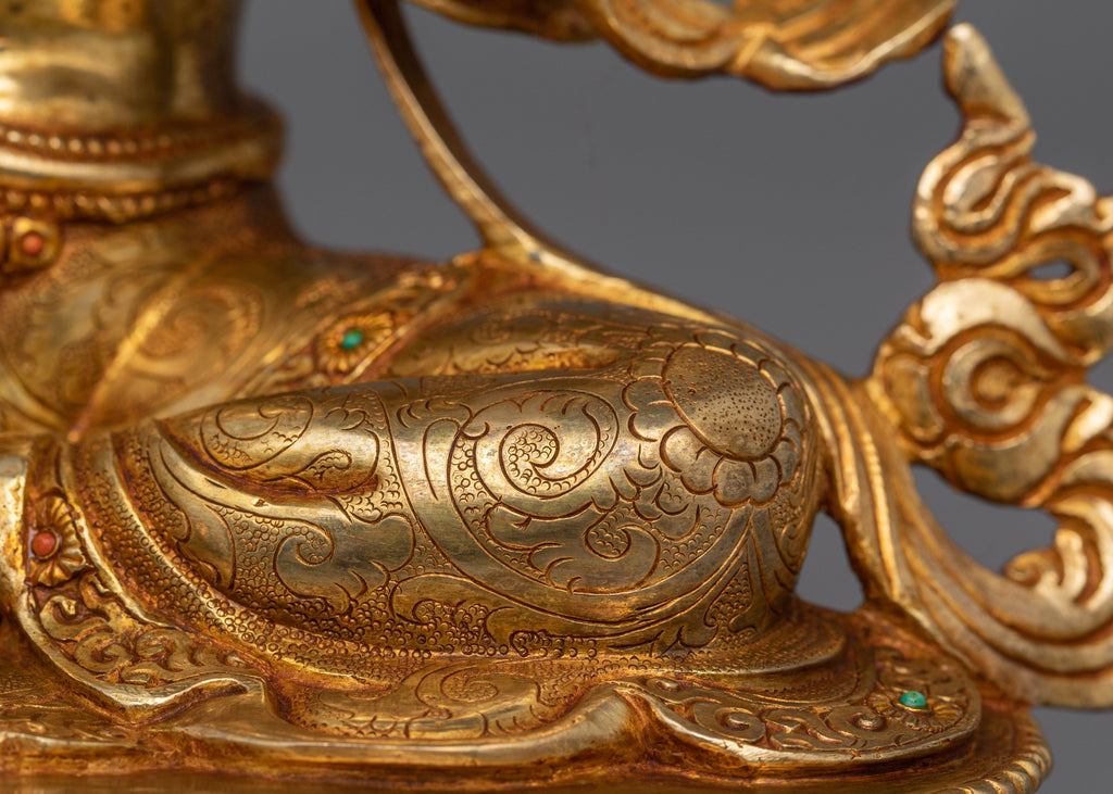 This Green Tara Spiritual Swift Liberator Statue represents protection, healing, and spiritual enlightenment. This handcrafted statue, which measures 9.4" (Height) x 7.5" (Base) and weighs 1.83 kg, is made of copper and adorned with 24k gold gilded. Crafted by expert artisans, this item symbolizes the rich traditions of Himalayan Buddhism, making it an important addition to altars, meditation places, or holy collections.