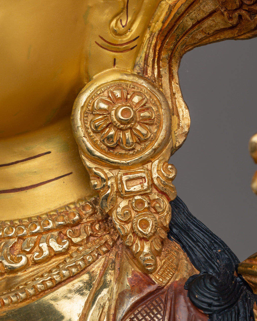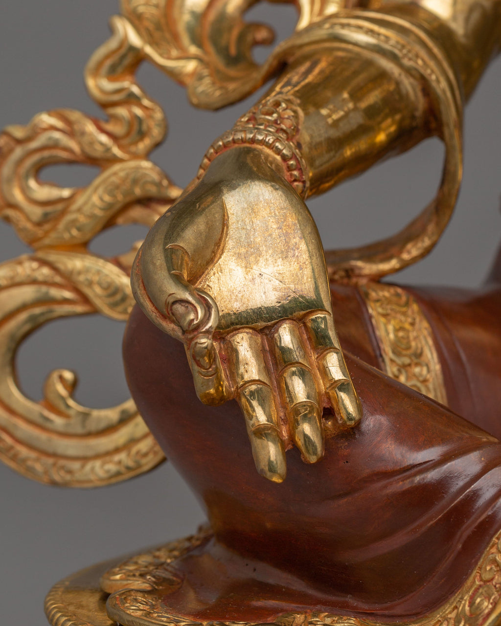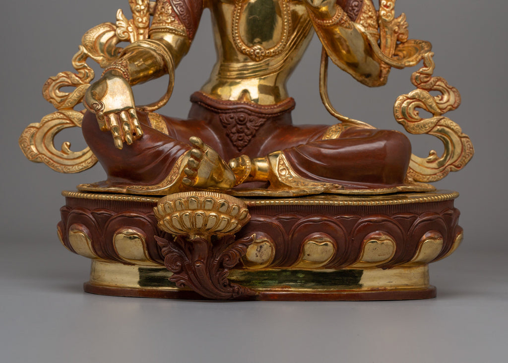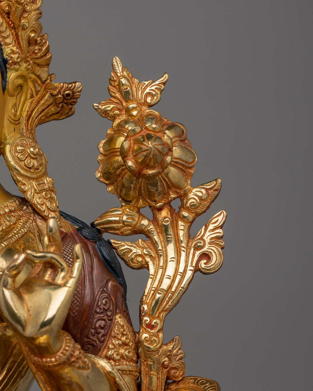 As depicted, Green Tara is shown seated on a lotus throne with her right leg typically extended forward, signifying her active compassion and willingness to help. Her hands express profound meaning through their gestures. The right hand is displayed in the "gesture of giving" (Varada Mudra), symbolizing her boundless generosity and willingness to provide blessings. Meanwhile, her left hand delicately holds a blue lotus (Utpala), a symbol of purity and spiritual awakening, offering protection and reassurance to those who seek her guidance.