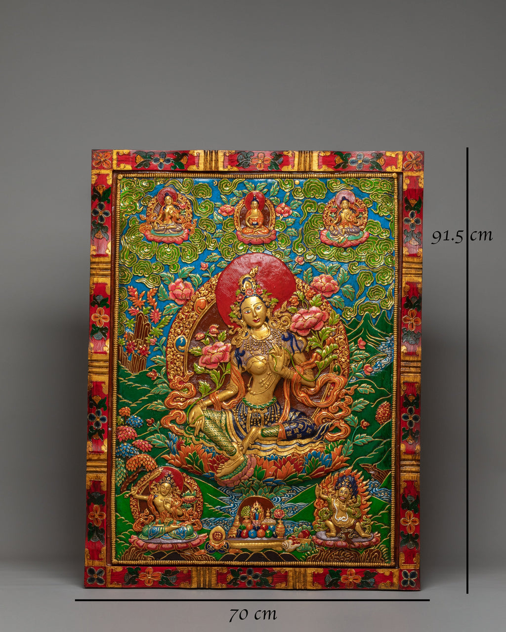 This magnificent Green Tara Thangka wall hanging is a masterfully handcrafted representation of one of Tibetan Buddhism's most beloved deities. Measuring 91.5cm in height and 70cm in width, this substantial piece weighs 12.10kg and is crafted from stone dust with epoxy binding on a wooden backing. Green Tara, known as the "Mother of Liberation," serves as the influential central figure, symbolizing compassion, protection, and swift action in removing obstacles. This Tibetan Buddhist thangka is a sacred tool for meditation, devotion, and creating a sanctuary of peace within your home, yoga studio, or meditation room.