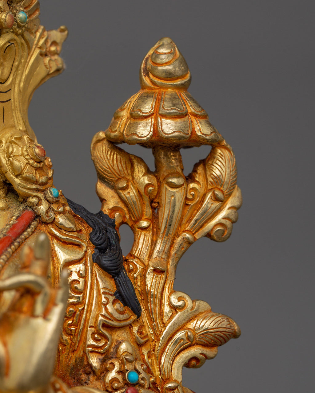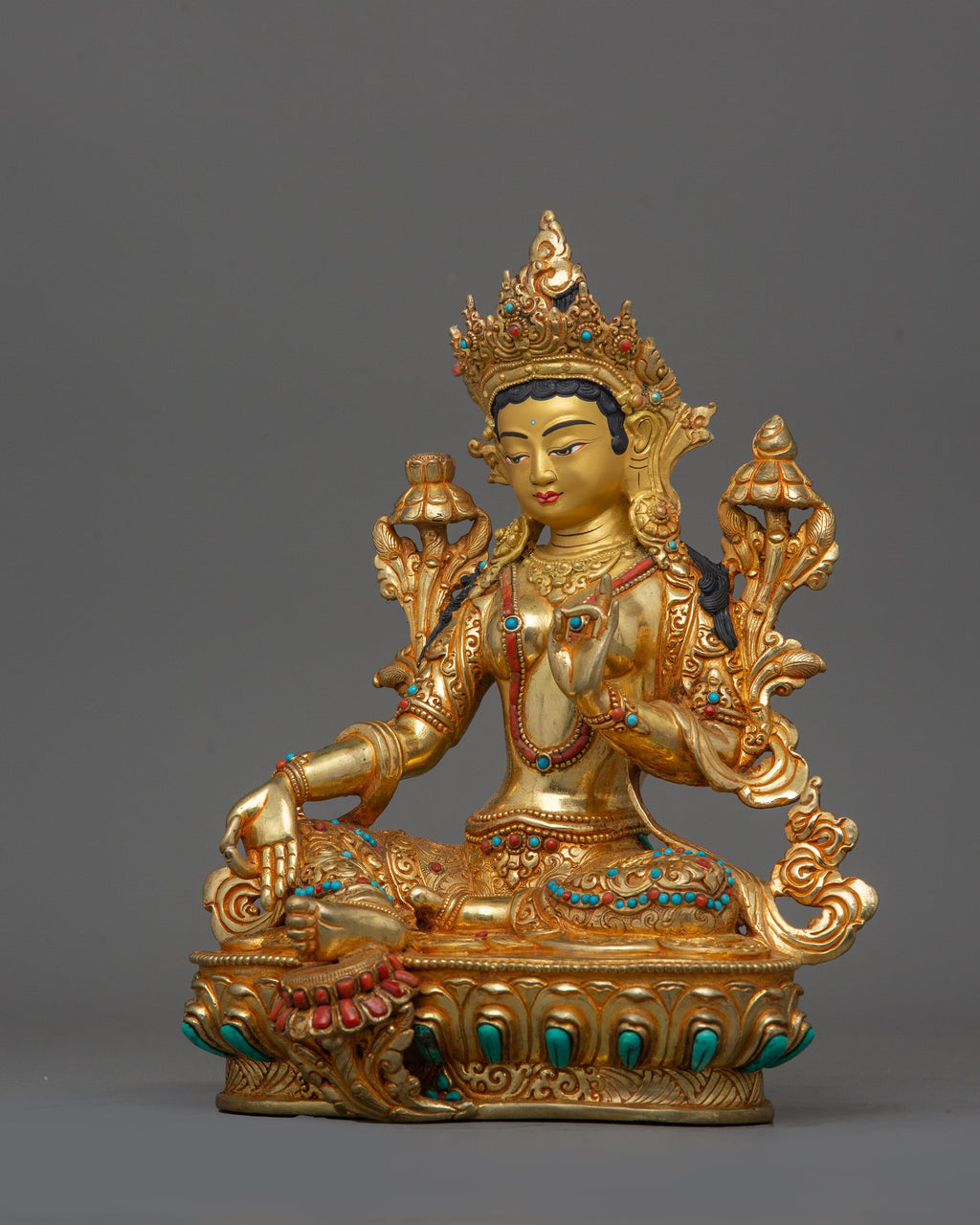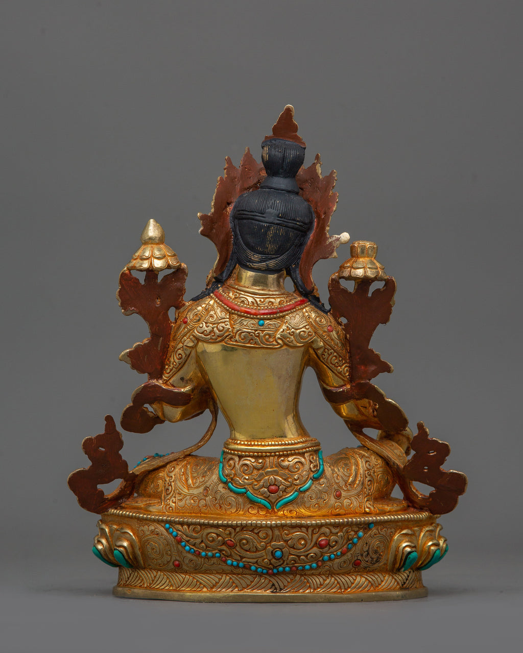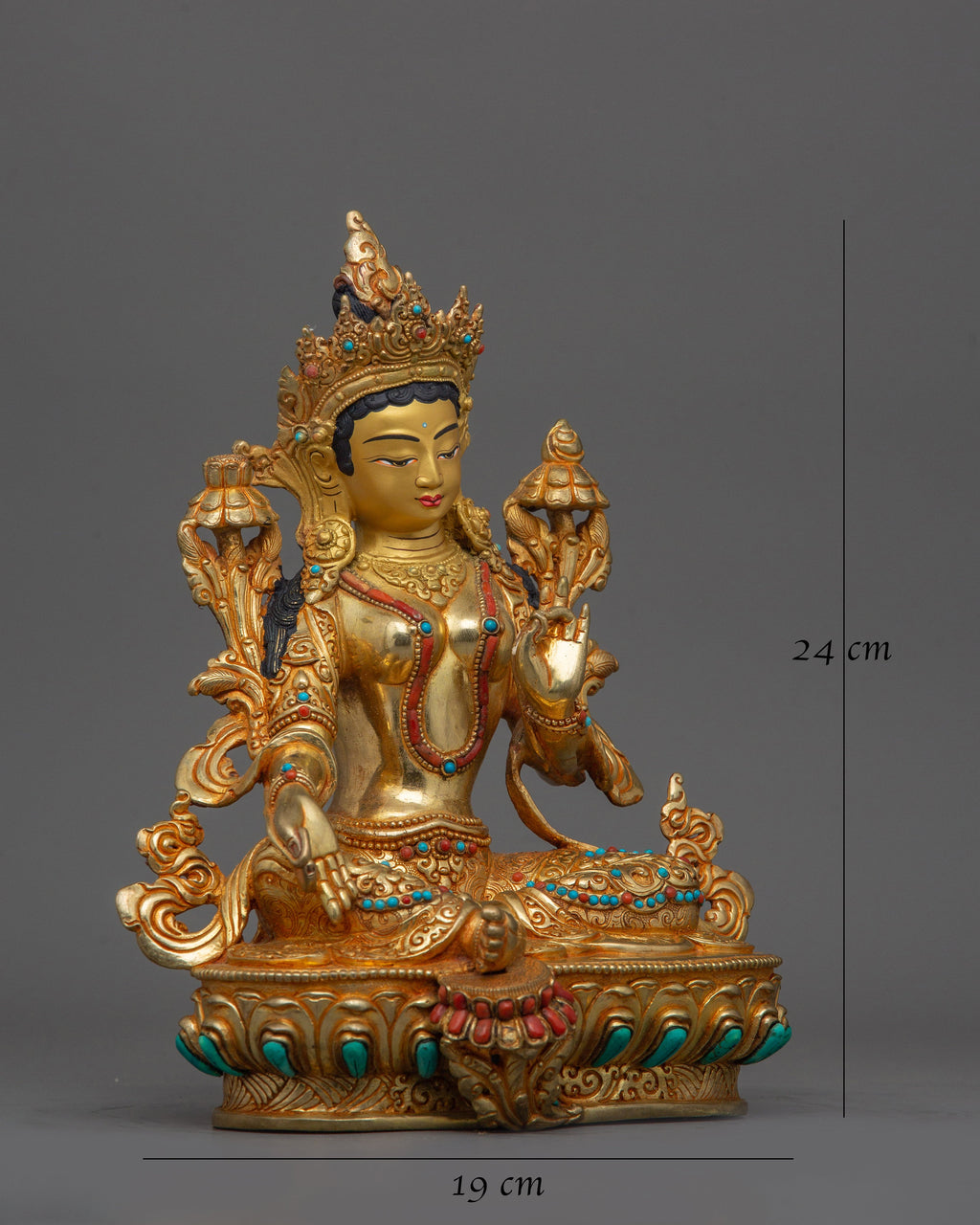This handcrafted statue represents Green Tara, the Goddess of Compassion and Protection. This statue, which measures 9.4" (Height) x 7.5" (Base) and weighs 2.47 kg, is crafted of copper, covered with 24K gold gilding, detailed with bright gold and acrylic paints, and adorned with hand-carved gemstones. This item, created by skilled Nepalese artisans, is a beautiful and meaningful addition to altars, meditation places, or sacred collections.