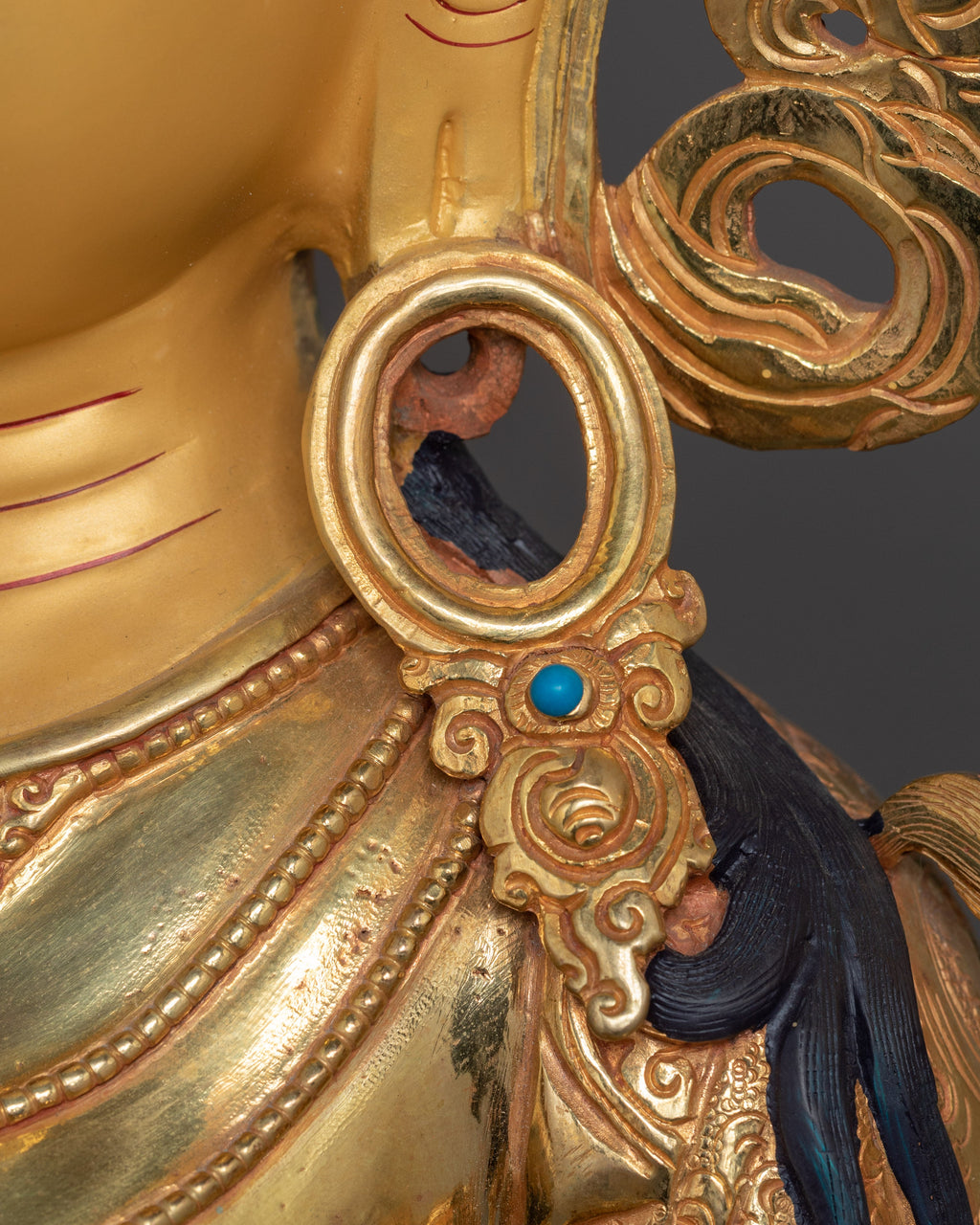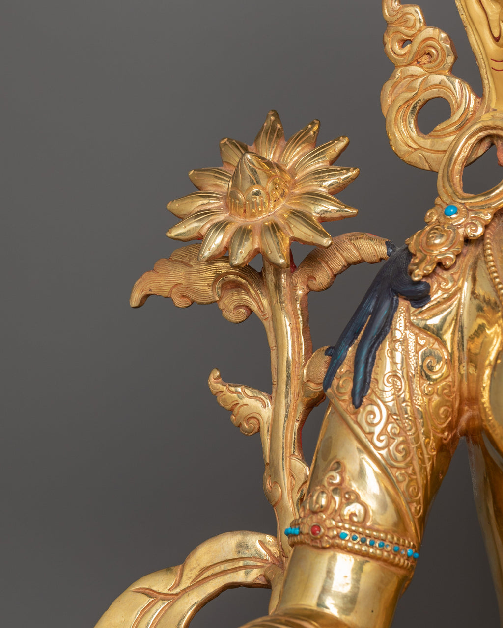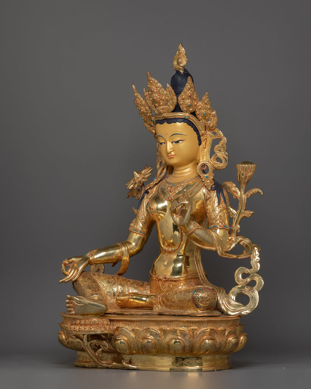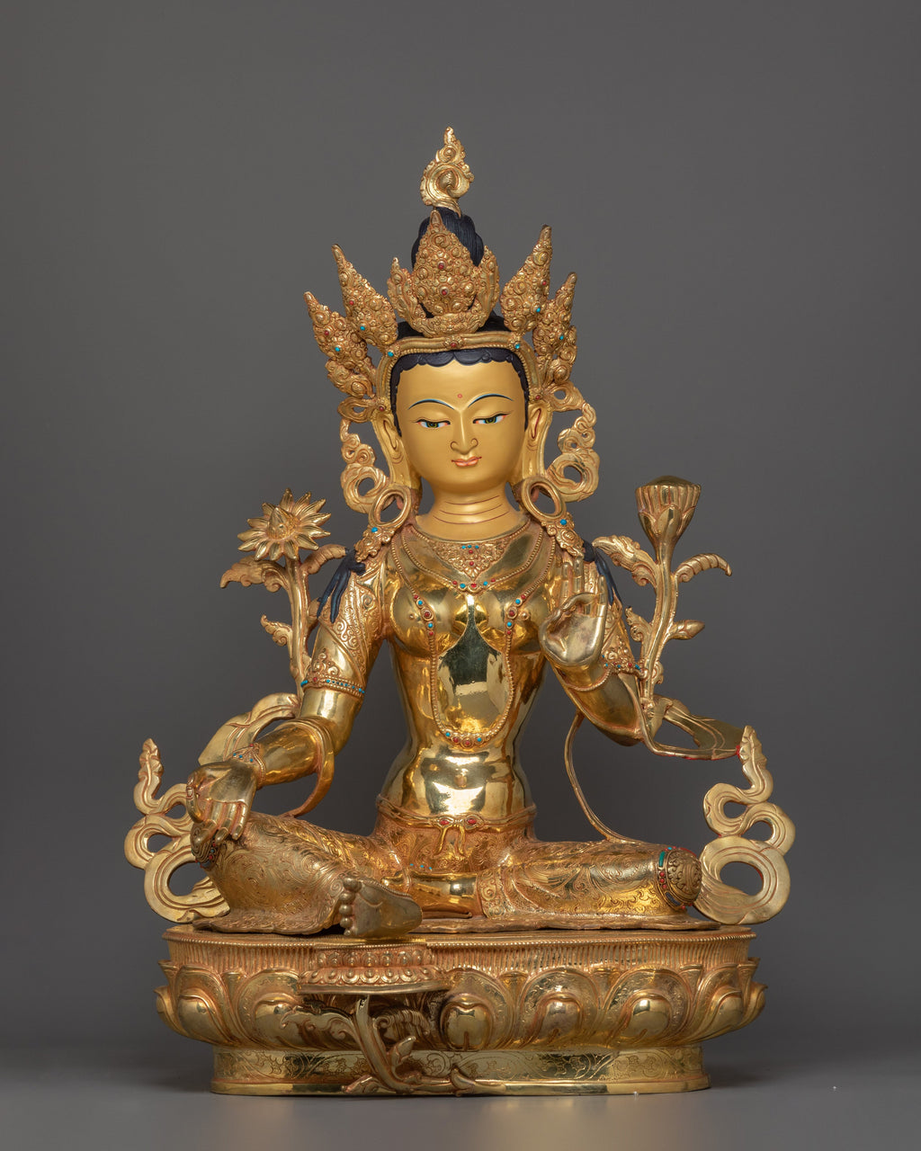 This Statue of "The Liberator" Green Tara stands 26.2 inches (66.5 cm) tall with a base measuring 18.7 inches (47.5 cm), and weighs 19.05 kilograms, making it solid and substantial. It is made from a copper body, gilded with 24K gold for a radiant, sacred appearance. The surface is hand-painted with gold and acrylic paints, adding vibrant color and spiritual symbolism, and it is adorned with gemstones that enhance its elegance and divine presence. Designed by talented Nepalese artisans, this detailed sculpture is ideal for altars, meditation areas, or as a meaningful decor item for individuals seeking awareness in their daily life.