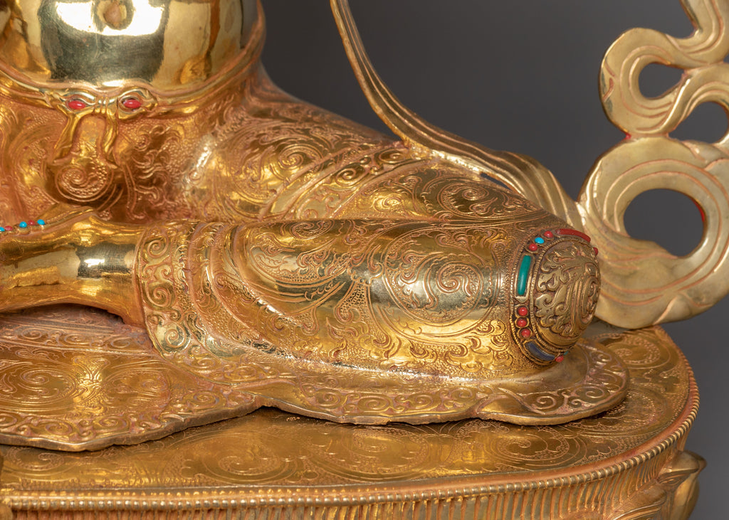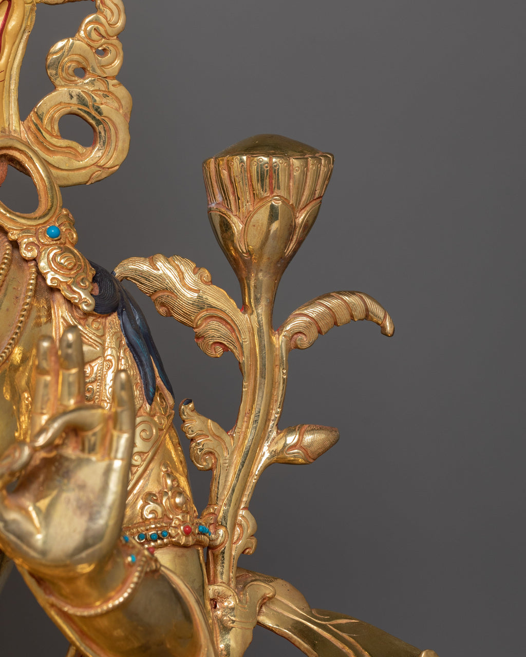 Green Tara is a compassionate deity who offers swift protection and support to those in need. Her right leg is extended forward, symbolizing her readiness to take immediate action to help sentient beings. The green color represents vitality, renewal, and a deep connection to nature. Seated gracefully on a lotus, she embodies purity and spiritual growth, with lotuses in both hands reinforcing this symbolism. According to legend, she arose from the tears of Avalokiteshvara (Chenrezig) when he wept in sorrow over the endless suffering of beings. Green Tara performs the Varada Mudra with her right hand, the gesture of generosity, fulfilling the wishes of her devotees. Her left hand forms the Three Jewel Mudra, symbolizing the Buddha, the Dharma (teachings), and the Sangha (spiritual community). She is adorned with radiant gems and flowing silk garments, reflecting her divine presence and enlightened nature.