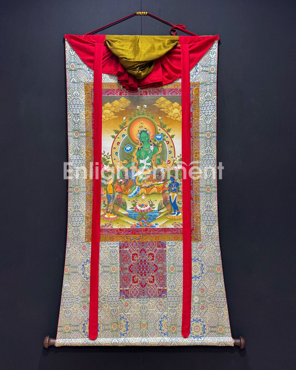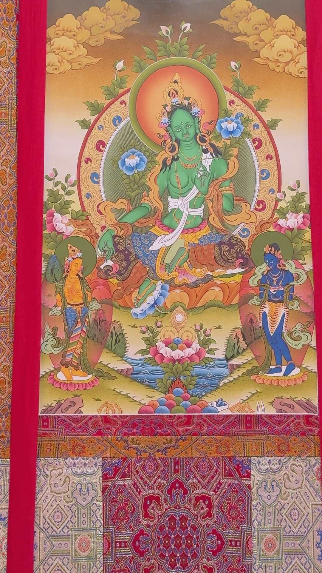 Traditional Thangka of Green Tara with Bodhisattva | Tibetan Female Buddha Painting | Brocade Mounted