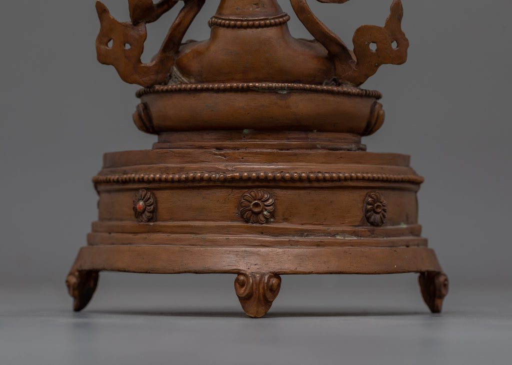 The Guardian Manjushri Sculpture, measuring 7.7 inches (19.5 cm) in height and 5.5 inches (14 cm) at the base, is a compact yet exquisite representation of the Bodhisattva of Wisdom. Crafted from oxidized copper, the statue features intricate details brought to life with skillful acrylic painting. His serene yet powerful representation encourages seekers to strengthen their spiritual practice and accept the path to enlightenment.