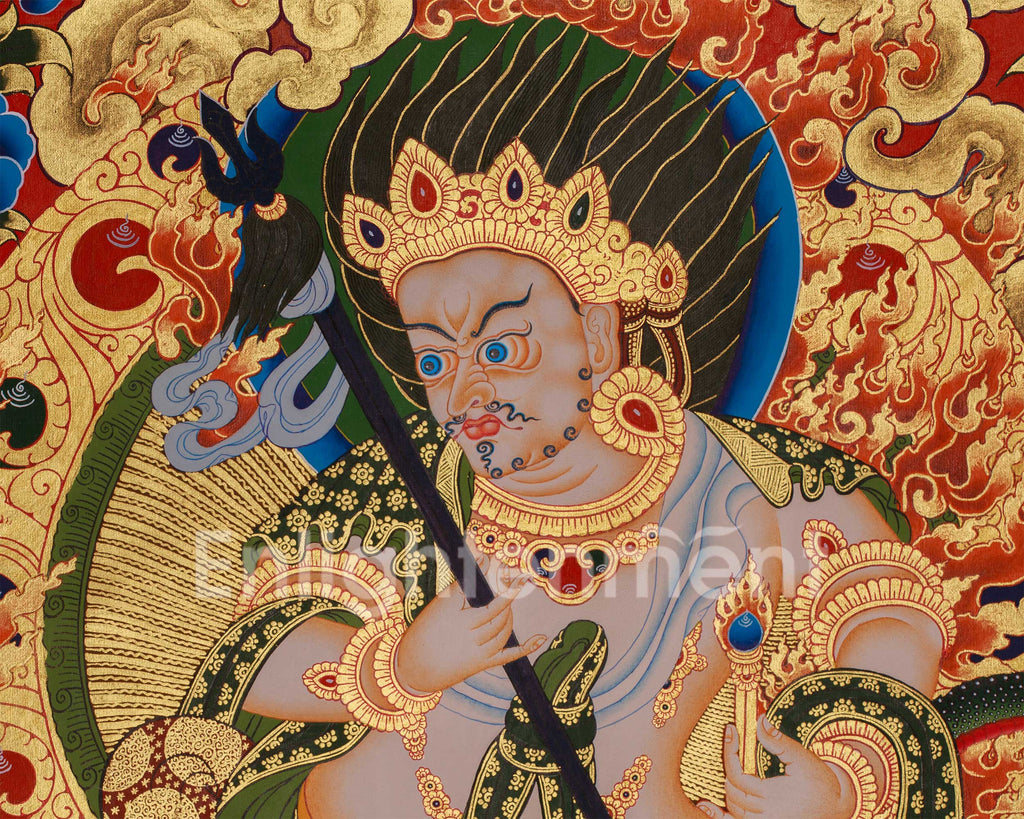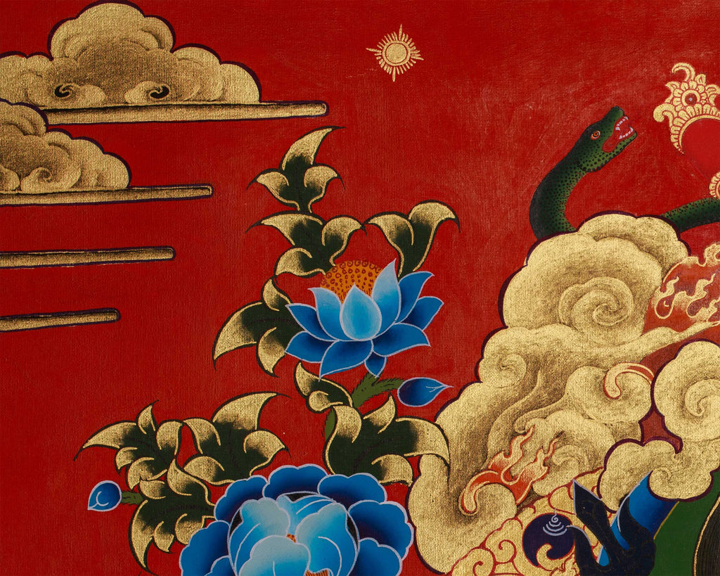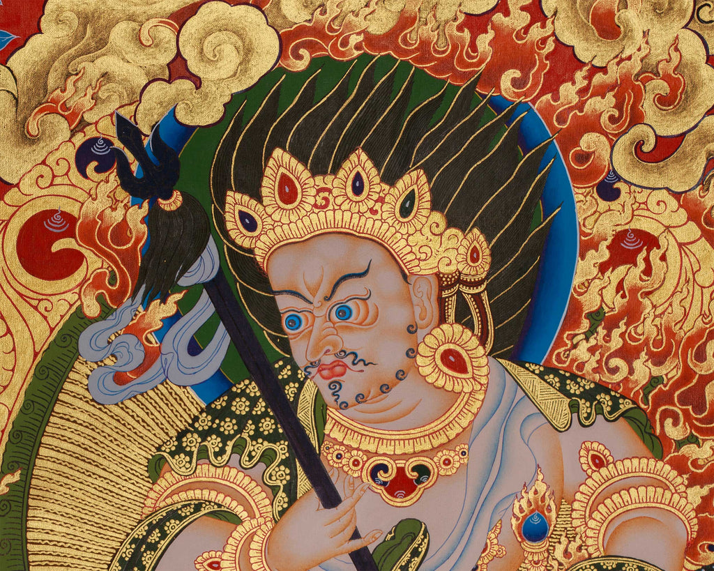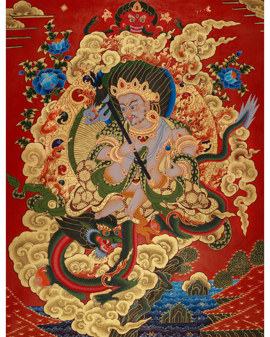 White Dzambhala Thangka is a powerful Tibetan symbol of wealth and prosperity. The deity is portrayed in a dynamic, seated posture atop a dragon. The dragon symbolizes protection, movement, and mastery over obstacles while holding a trident-tipped staff, symbolizing dominion over opposing forces. Surrounding Dzambhala are swirling golden clouds and luminous floral motifs. The wrathful guardian face of Kirtimukha emerges from the clouds, protecting the spiritual sanctity of the deity's domain.