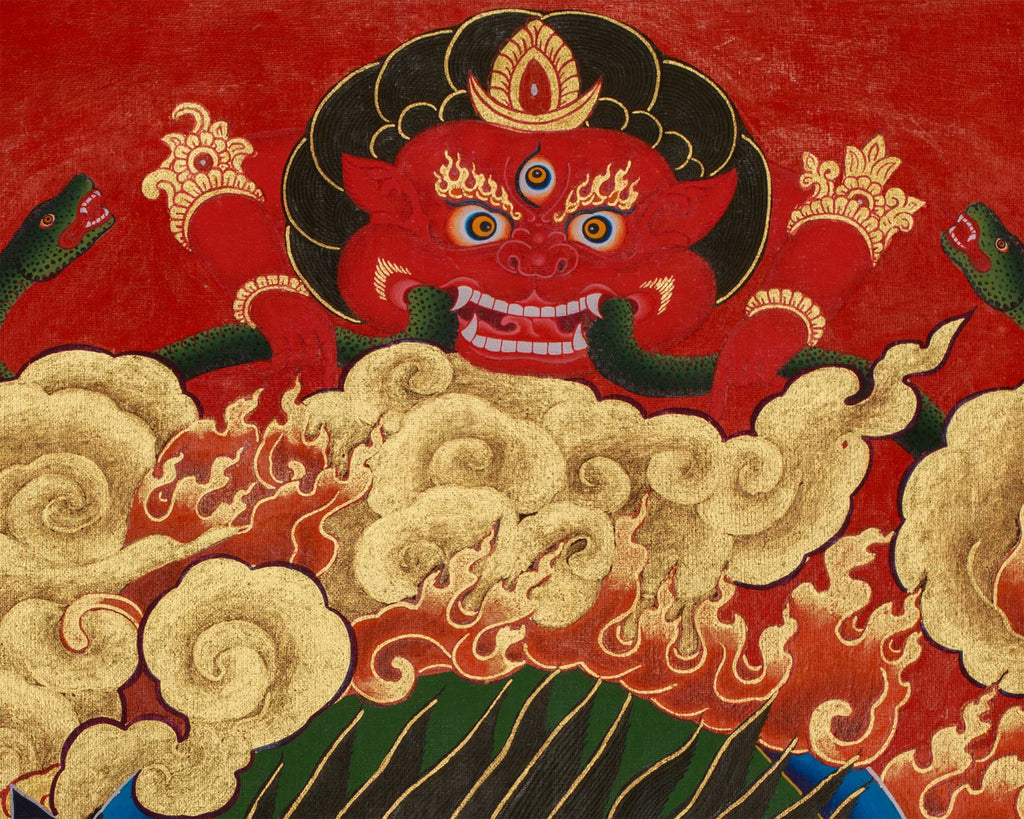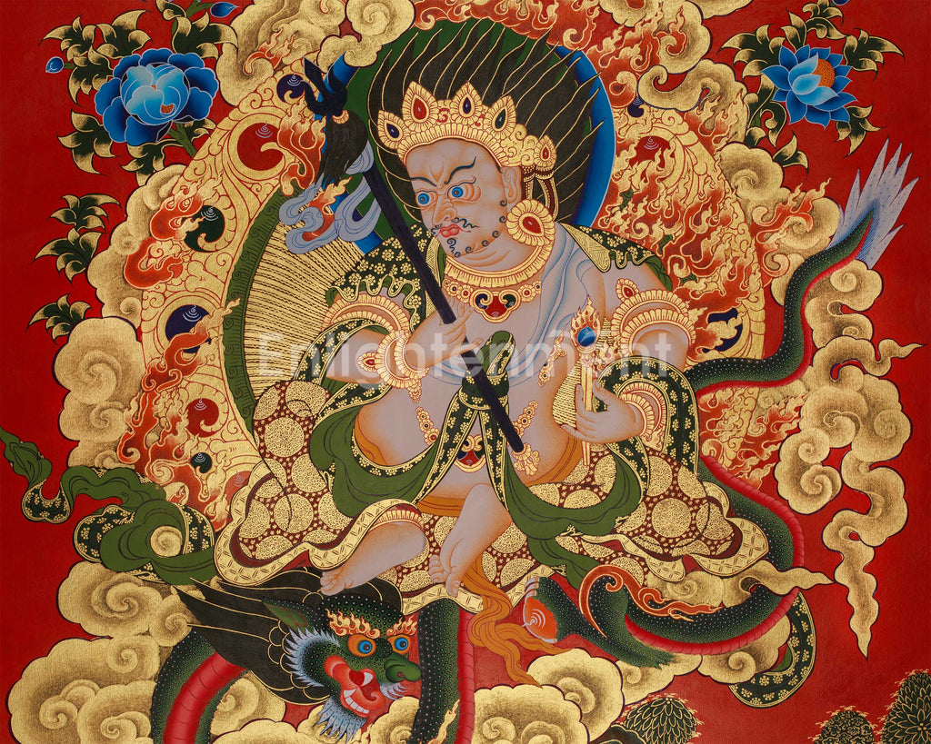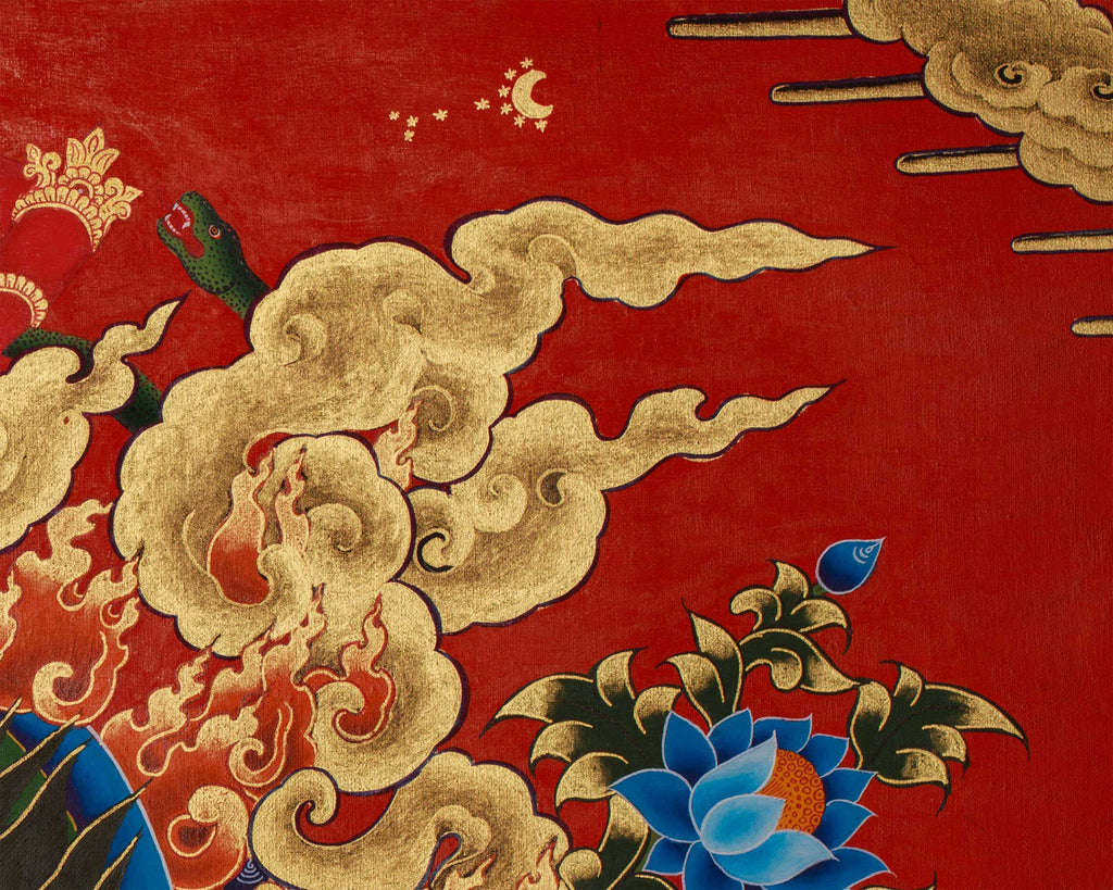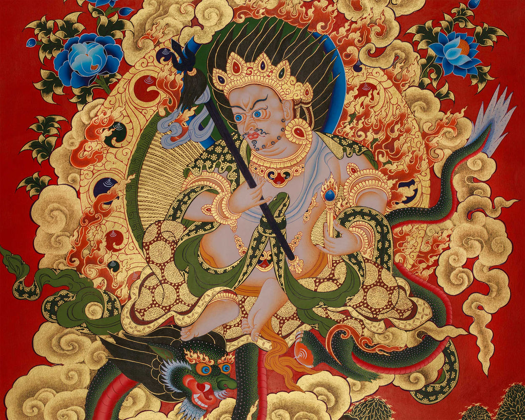 White Dzambhala Thangka is a powerful Tibetan symbol of wealth and prosperity. The deity is portrayed in a dynamic, seated posture atop a dragon. The dragon symbolizes protection, movement, and mastery over obstacles while holding a trident-tipped staff, symbolizing dominion over opposing forces. Surrounding Dzambhala are swirling golden clouds and luminous floral motifs. The wrathful guardian face of Kirtimukha emerges from the clouds, protecting the spiritual sanctity of the deity's domain.