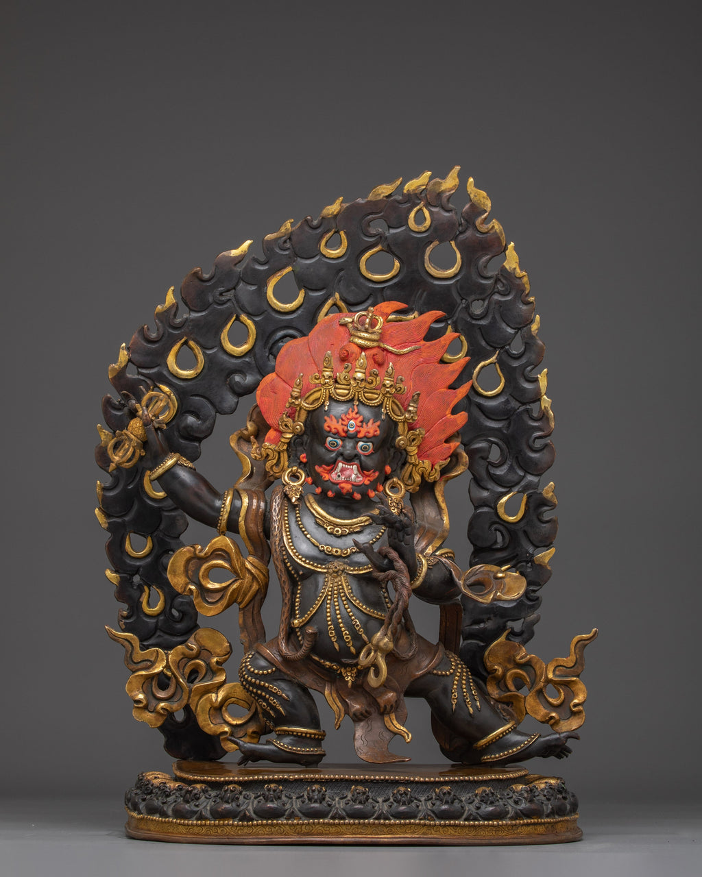 His bulging eyes, sharp fangs, and fiery eyebrows symbolize his fierce determination to destroy ignorance and protect spiritual practitioners. Bone ornaments and skull garlands signify impermanence and mastery over ego and fear. The right hand holds a vajra, symbolizing spiritual power to annihilate ignorance. The left-hand lasso binds harmful forces. A warrior-like stance with one leg bent forward and the other extended backward, symbolizing readiness and active engagement in protecting the Dharma. A fiery halo represents purification and transformation through wisdom. He is in Bhutadamara Mudra, which is associated explicitly with subduing spirits and harmful forces. This gesture is characterized by the crossing of wrists, with the palms facing outward and the little fingers linked, forming a chain-like shape. The mudra resembles Garuda's wings and symbolizes a threatening yet protective stance, aimed at taming unruly spirits and dispelling negativity.