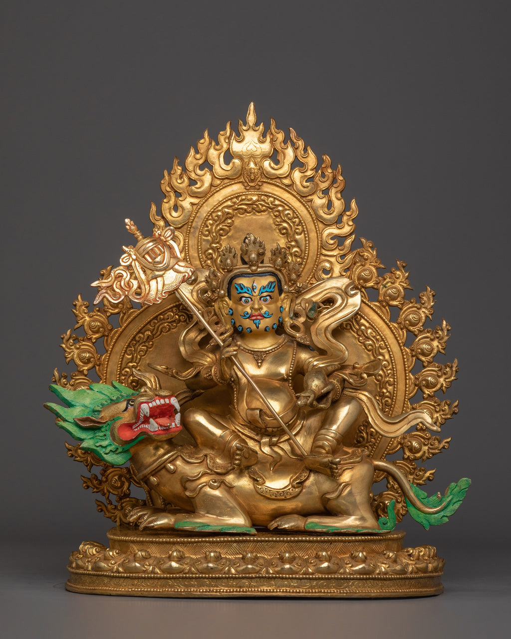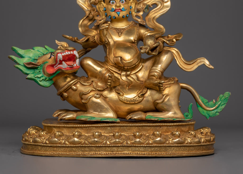 Namtoshe, the Buddhist god of wealth, is depicted with a golden-yellow complexion, symbolizing abundance and positive energy. Seated calmly on a lotus disc and riding a lion, he embodies strength and royal authority. In his left hand, he holds a mongoose that spits jewels, representing the triumph over greed and the granting of material and spiritual wealth. His right hand carries a triumph banner, signifying his power as a victorious protector. Surrounded by a glowing golden halo, which complements his wealth and authoritative nature, Namtoshe wears a five-pronged crown, symbolizing the Five Transcendental Buddhas. His expression and posture radiate authority and power, asserting his commanding presence. With three piercing eyes, he perceives all realms, embodying prosperity and the wisdom to use wealth for the greater good of all beings.