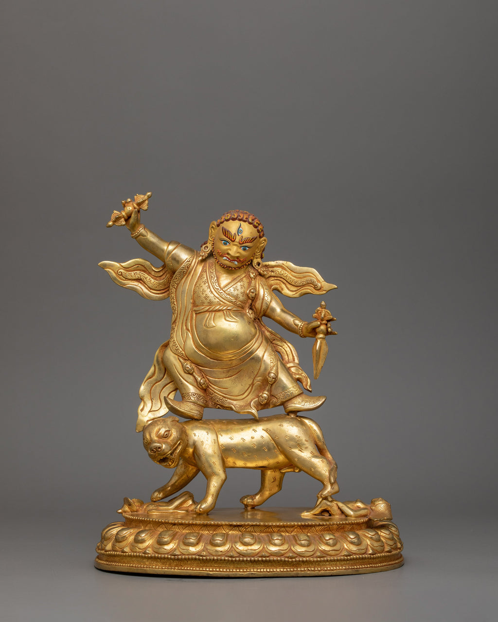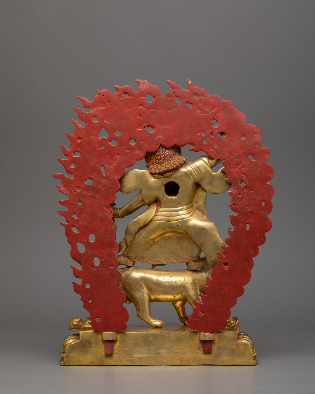 Guru Dorje Drollo, one of Padmasambhava’s wrathful manifestations, symbolizes the transformation of ignorance and fear into enlightenment. His dynamic pose and flaming aureole represent the fearless energy required to transcend worldly illusions. Revered for dispelling obstacles and negative forces, this statue is ideal for practitioners seeking spiritual protection and wisdom. Handcrafted in Nepal, this piece reflects authentic Tibetan artistry, making it a treasured collectible for Buddhist devotees.