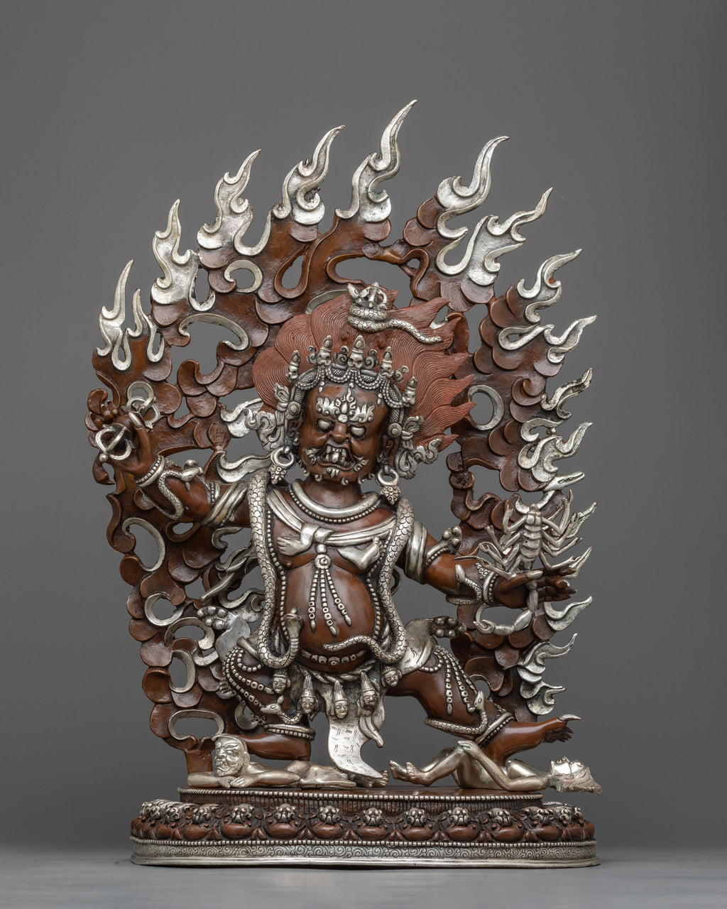 He wears a crown adorned with skulls and a garland of severed heads. In this wrathful meditational form, Guru Dragpo was an important protector deity of the Nyingma School of Tibetan Buddhism. He stands before a flaming halo atop a male and female body. He wears a human skull and a snake as an ornament. His headpiece is carved from five skulls, and he is seen holding a vajra in his right hand and a scorpion in the other hand. The Sculpture is constructed on a copper body and plated with silver by a group of skilled master artists of Nepal.