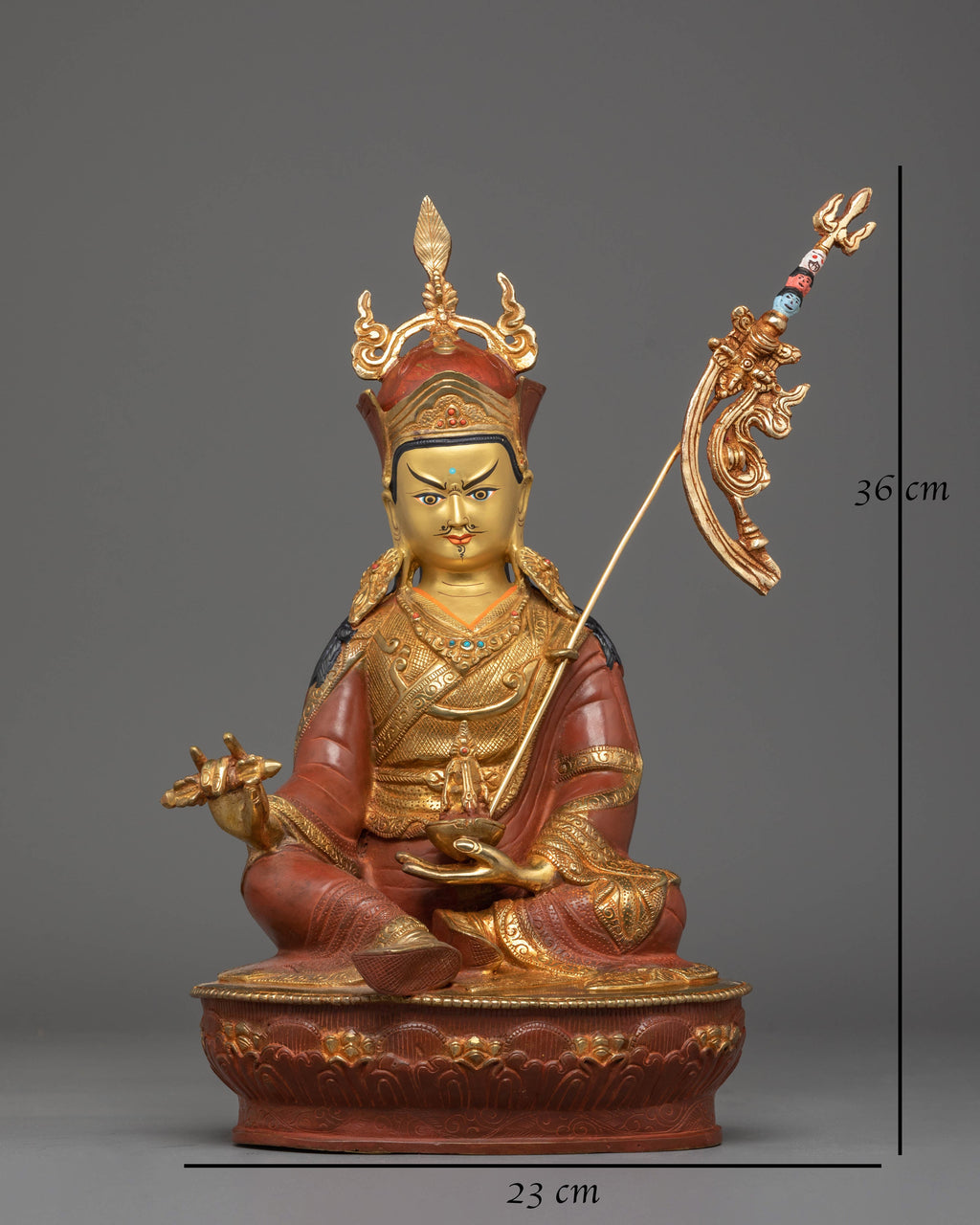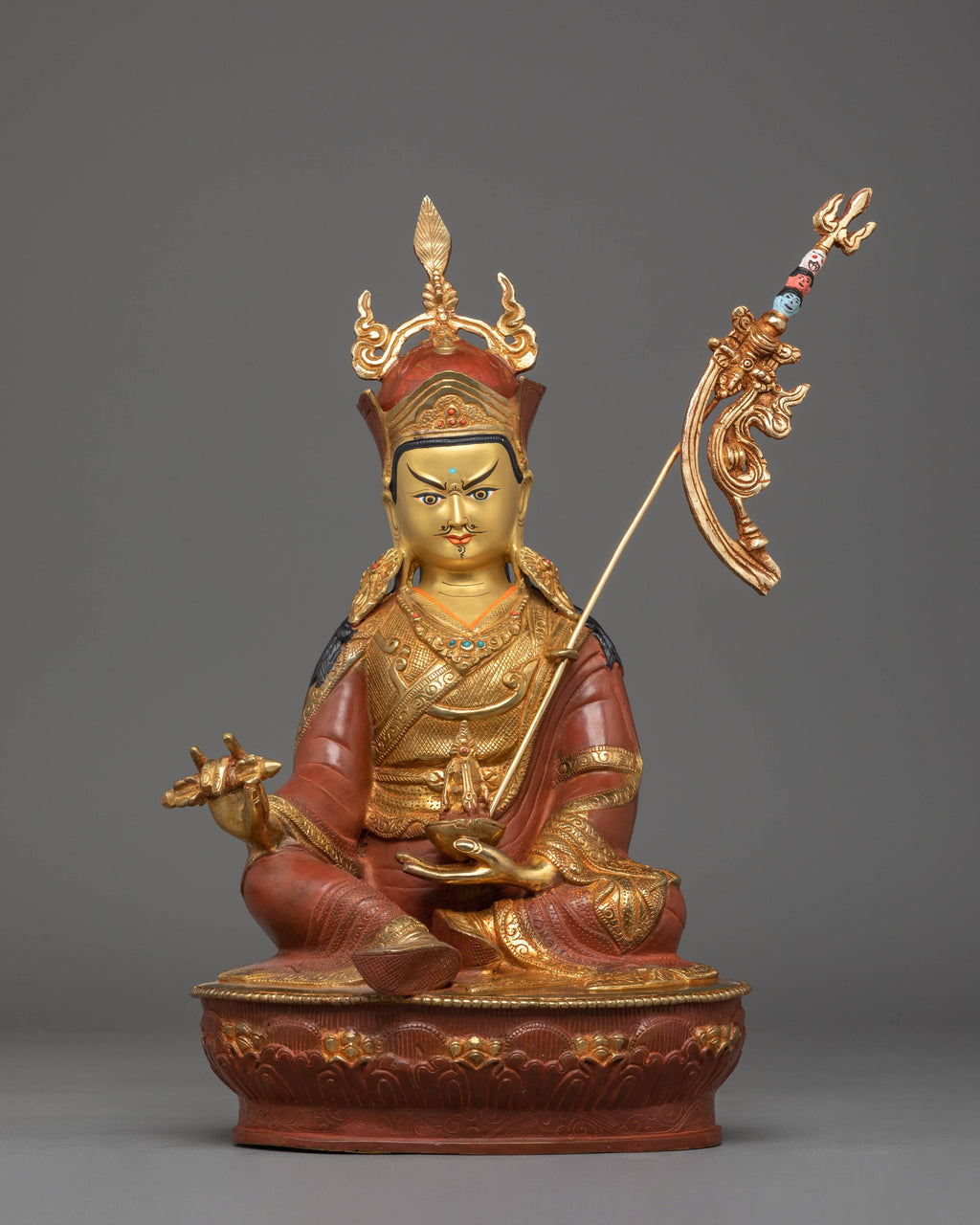 The design features Guru Gyalpo seated in regal poise upon a lotus throne, signifying purity and awakened awareness. His expressive face—accented with boldly painted features—conveys both compassion and power. The exquisitely carved garments, decorated with gold embellishments and intricate motifs, reflect the mastery of traditional Tibetan craftsmanship. In his hands, he holds ritual implements symbolizing authority, protection, and spiritual mastery, while the staff rising beside him represents unwavering strength and connection to the lineage. The coral and turquoise stones embedded across his crown and attire add depth, vitality, and cultural richness to the sculpture.