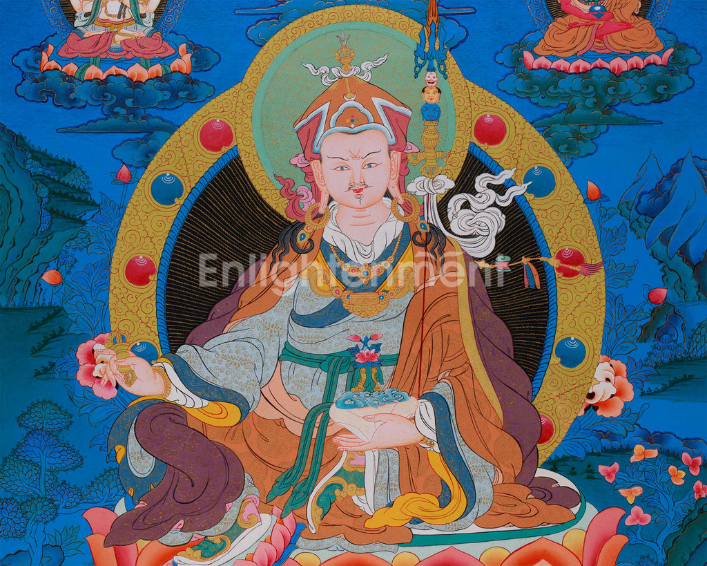 This brilliant Guru Padmasambhava Artwork depicts the Lotus-Born Master, venerated as the founder of Tibetan Buddhism, sitting serenely in the center of a colorful lotus base. Using vivid acrylic colors and genuine 24K gold, this gorgeous thangka is hand-painted on high-quality cotton canvas, bringing the image of Guru Rinpoche and the surrounding deities to life. The gold accents draw attention to the figures' purity and heavenly presence, especially the halo and ornamental parts, while the acrylic colors expertly capture the fine details of the deities' features, attire, and decorations. The whole composition preserves the thangka's profound cultural and spiritual importance while showcasing the traditional workmanship of an artist, guaranteeing both visual beauty and high creative value.