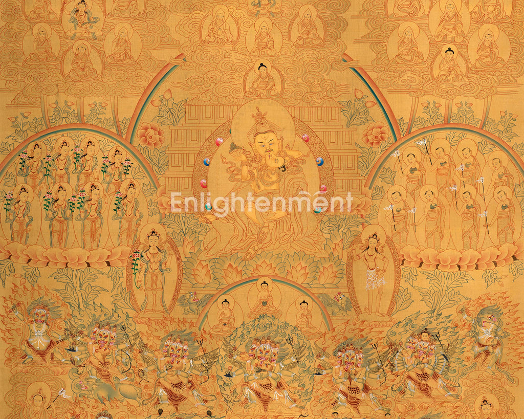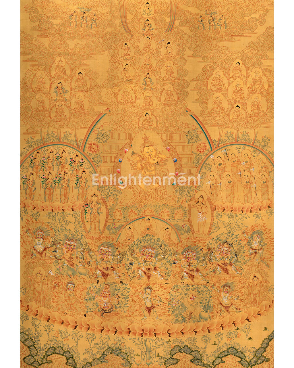 The Guru Rinpoche Lineage Tree Thangka is a profound masterpiece of hand-painted sacred Tibetan Buddhist art, meticulously crafted to convey the rich spiritual heritage of Guru Padmasambhava, also known as Guru Rinpoche. This stunning artwork unfolds a visual tapestry of lineage masters and spiritual teachings, tracing the spiritual genealogy of this revered figure. Each brushstroke on this thangka holds deep reverence and devotion, encapsulating the wisdom, blessings, and transformative power of Guru Rinpoche. Its intricate details and vibrant colors are not only a testament to the artistic skill of its creator but also serve as a powerful meditation aid, inspiring inner reflection, enlightenment, and spiritual connection. As a cherished symbol of Tibetan Buddhist tradition, this hand-painted thangka is a gateway to the divine, a tangible link to centuries of spiritual wisdom, and a sacred adornment for any space seeking to embrace the beauty of the spiritual journey.