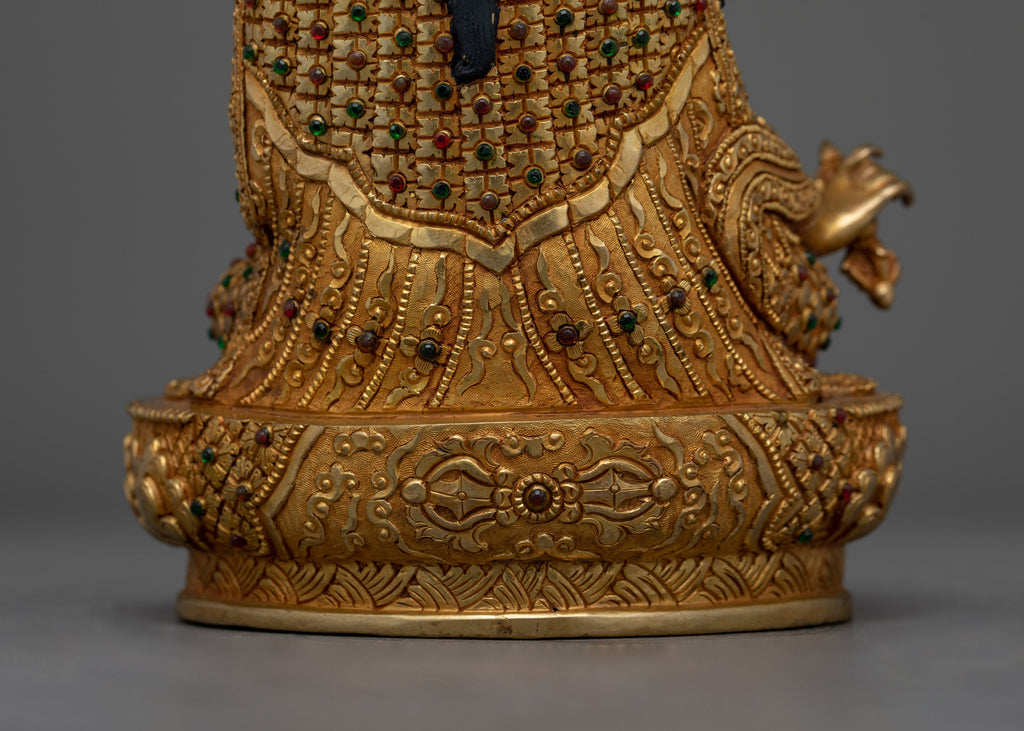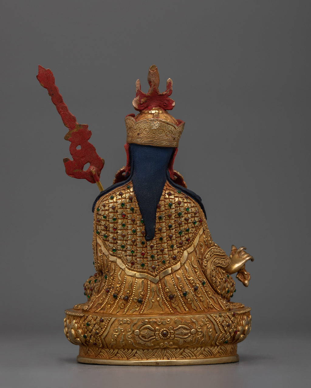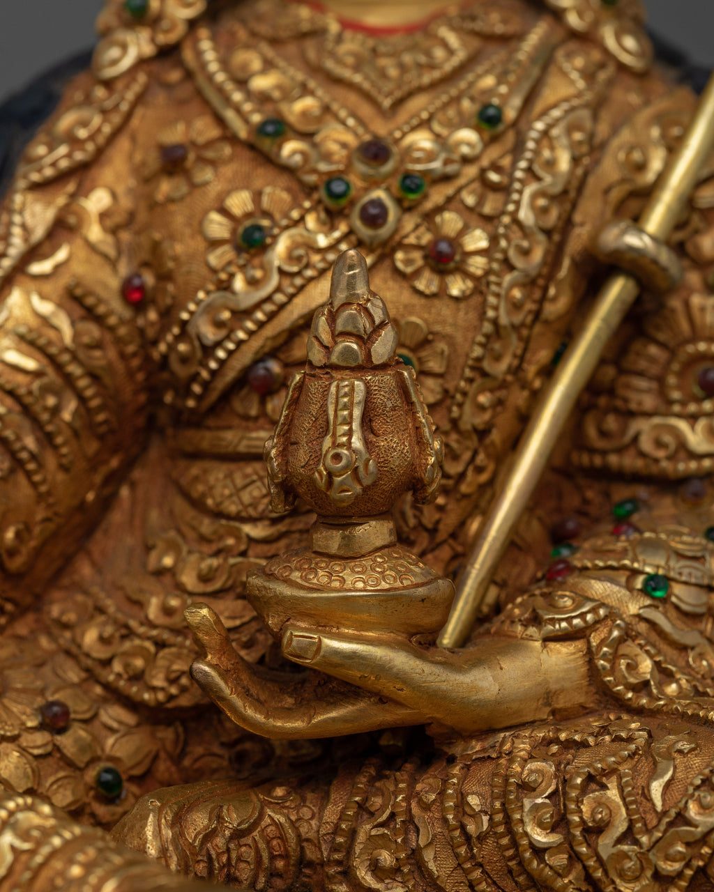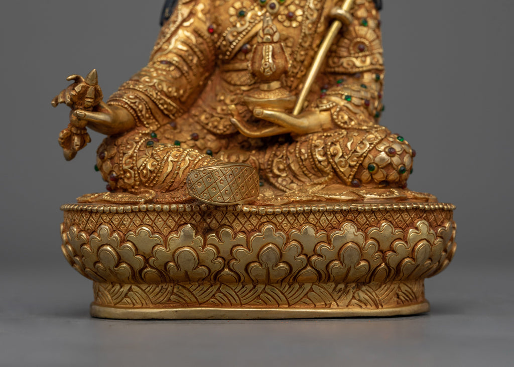 The statue has a lifelike and dynamic quality due to the skillfully carved precise carvings on its attire. Every element of the statue, from the profound look on Guru Rinpoche's face to the elaborate patterns of his apparel, is skillfully and carefully made thanks to the artists' precise attention to detail. The statue's timeless and venerated aspect is enhanced by the gold finish, which also heightens its spiritual and aesthetic appeal.