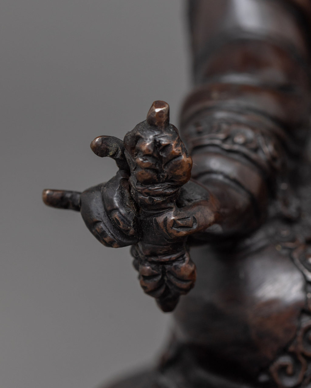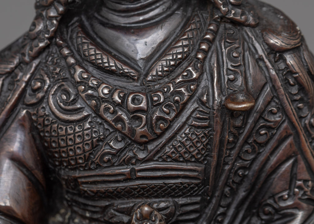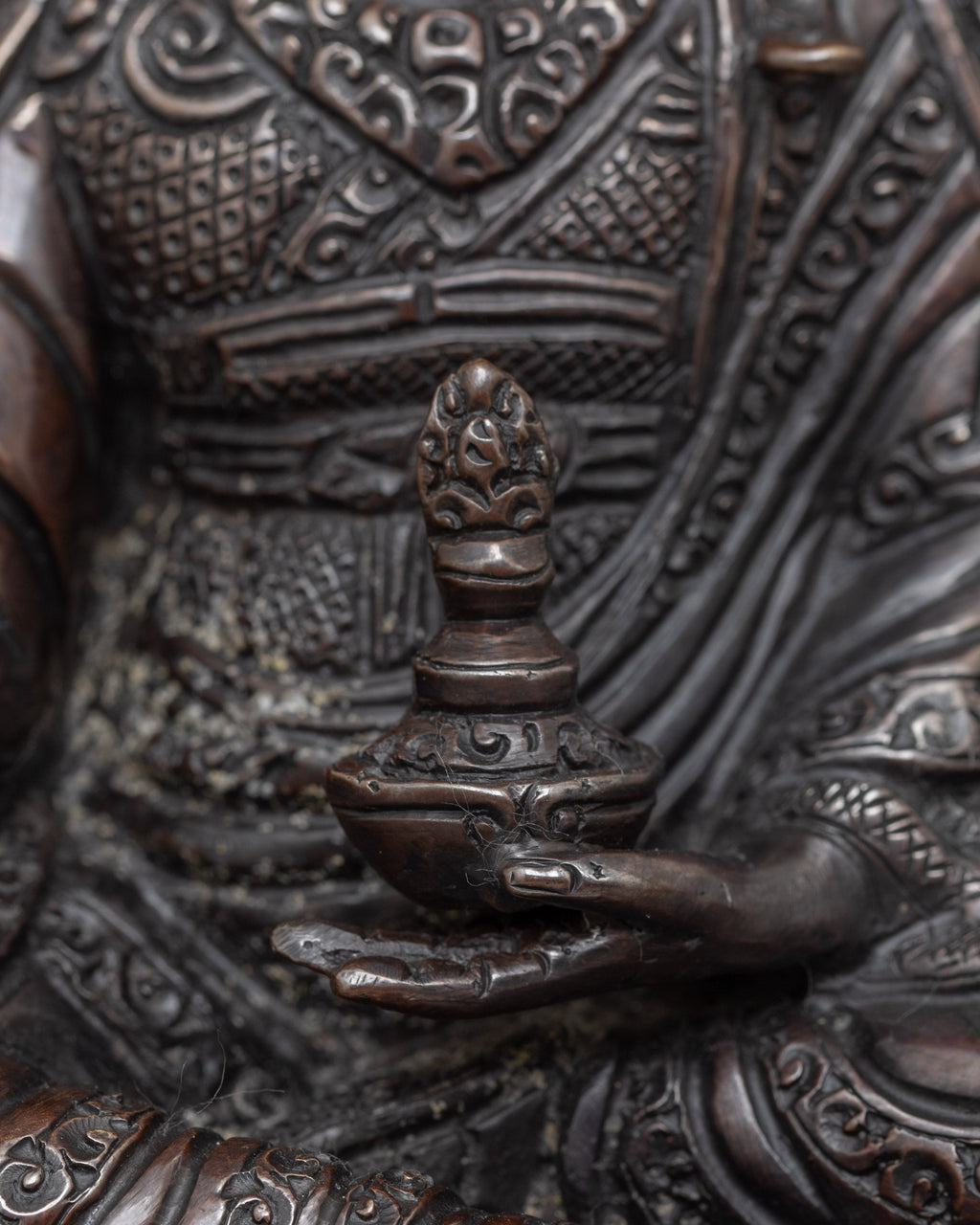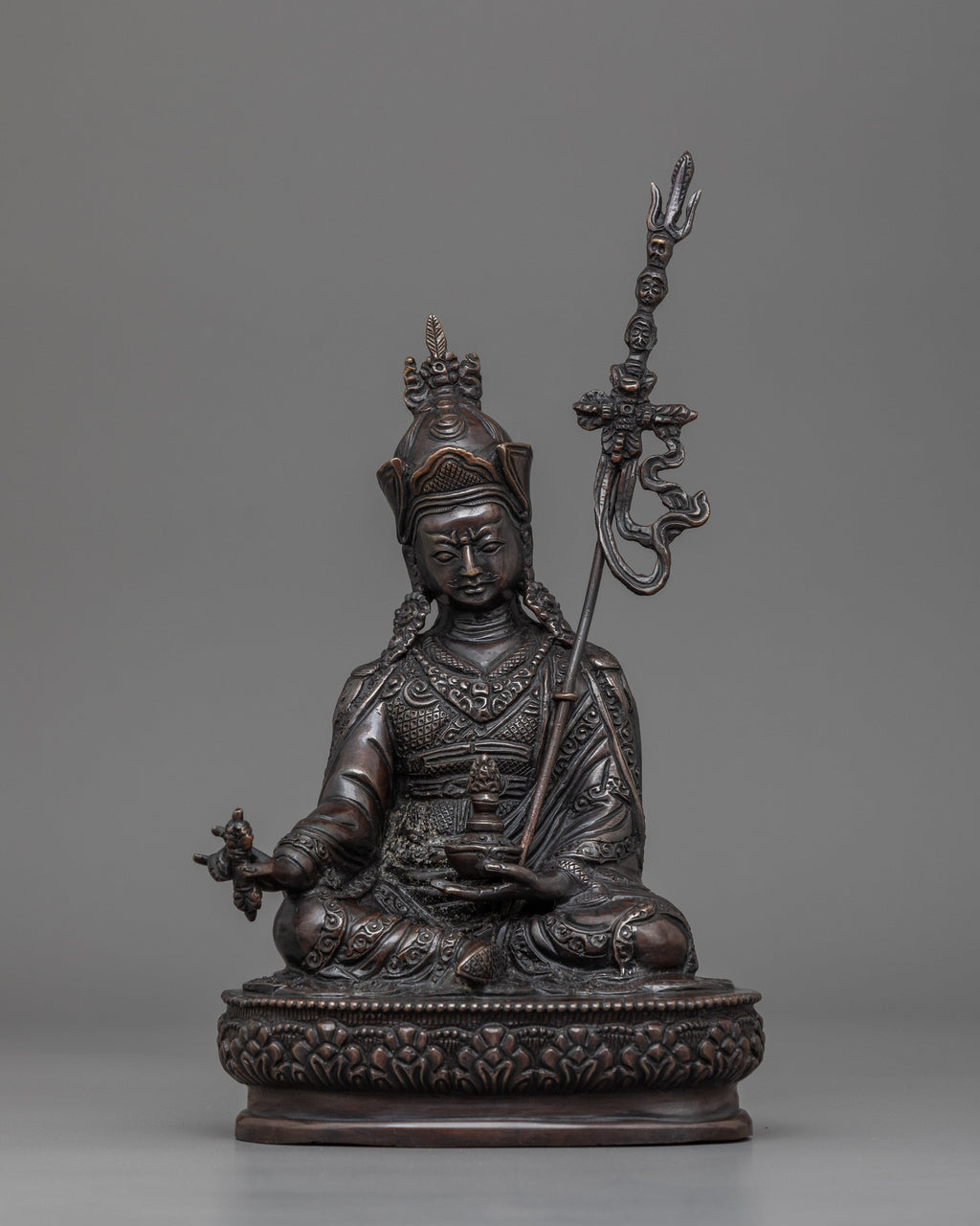 This Guru Rinpoche Statue, also known as Padmasambhava, represents Buddhist tantric Deity who introduced Vajrayana Buddhism into Tibet. This finely handmade statue, measuring 9.6" (Height) x 5.9" (Base) and weighing 1.26 kg, is made of oxidized copper and radiates durable reverence and sacred purity. This artwork, expertly carved by Nepalese artisans, represents Himalayan Buddhism's rich spiritual traditions, making it a powerful addition to altars, meditation places, and sacred collections.